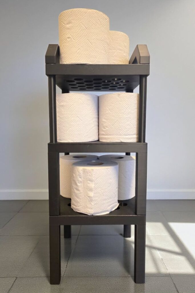 Bulk toilet paper packs often create clutter once the plastic packaging is opened. A tiered roll rack solves that problem by giving every roll its own place.