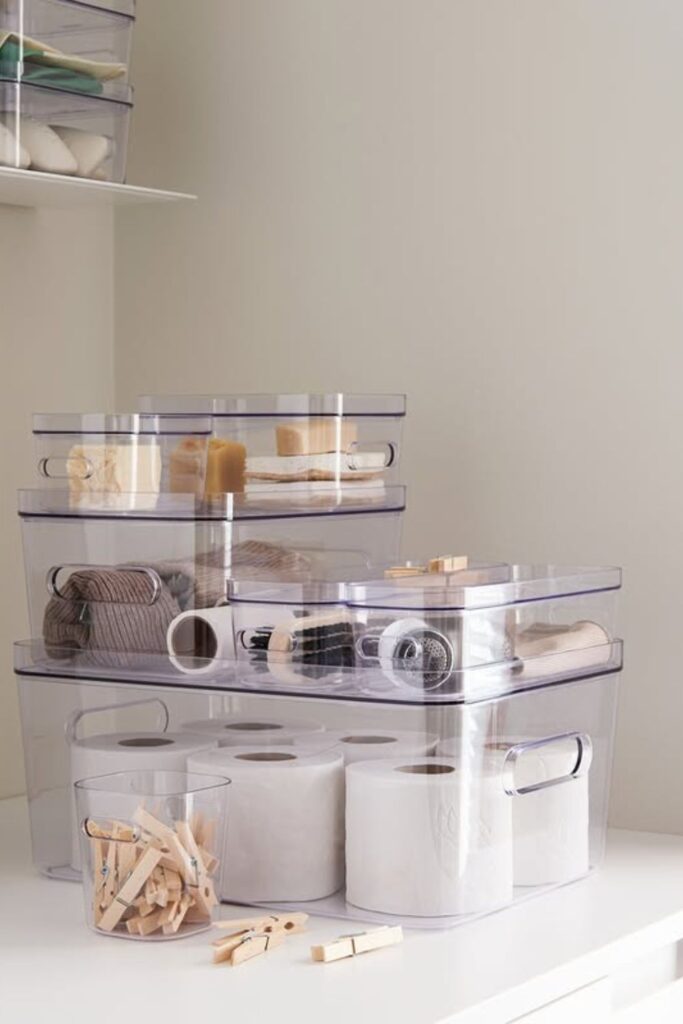 Closet shelves often turn into a messy pile once toilet paper packs are opened. Clear storage bins fix that problem by keeping every roll neatly contained and easy to find.