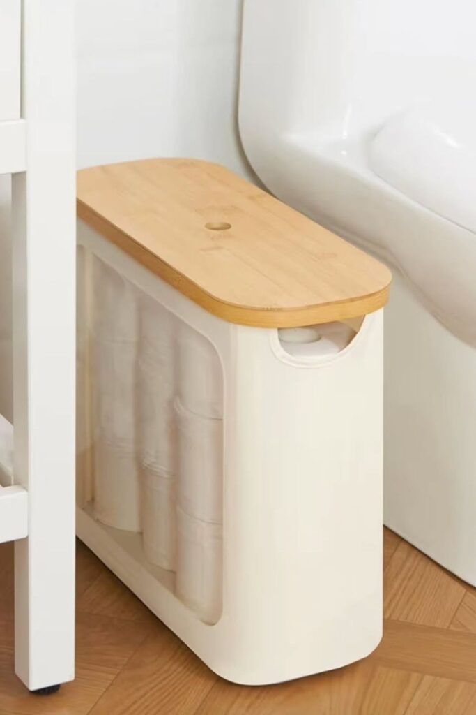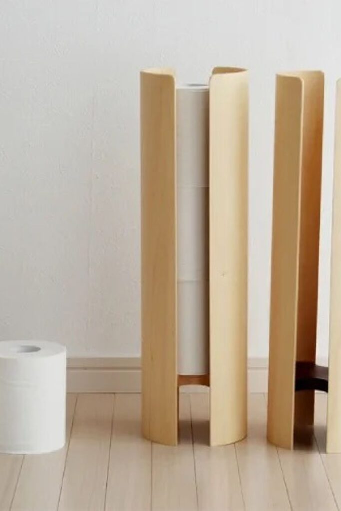 Bathroom storage can double as decor when the design feels intentional. A wooden roll tower like this turns extra toilet paper into a sculptural piece.