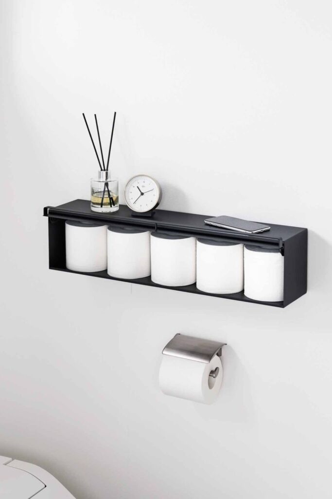 Bathroom walls often have more storage potential than people realize. A floating wall shelf like this keeps several extra rolls neatly lined up.