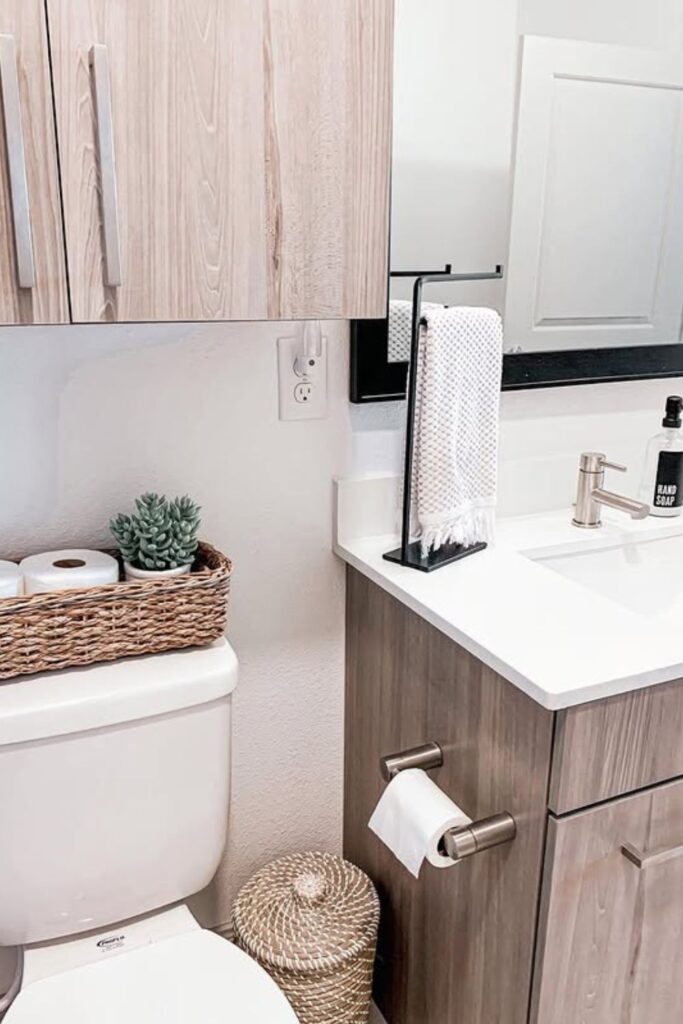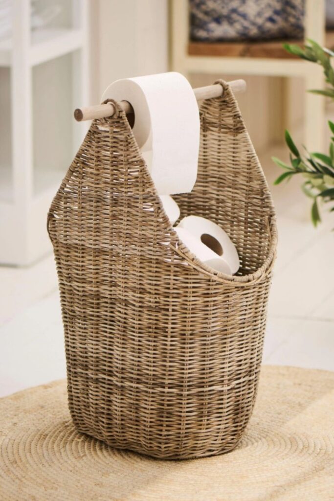 Blending storage with style often makes bathroom organization feel effortless. A woven basket holder like this keeps extra rolls neatly stored.