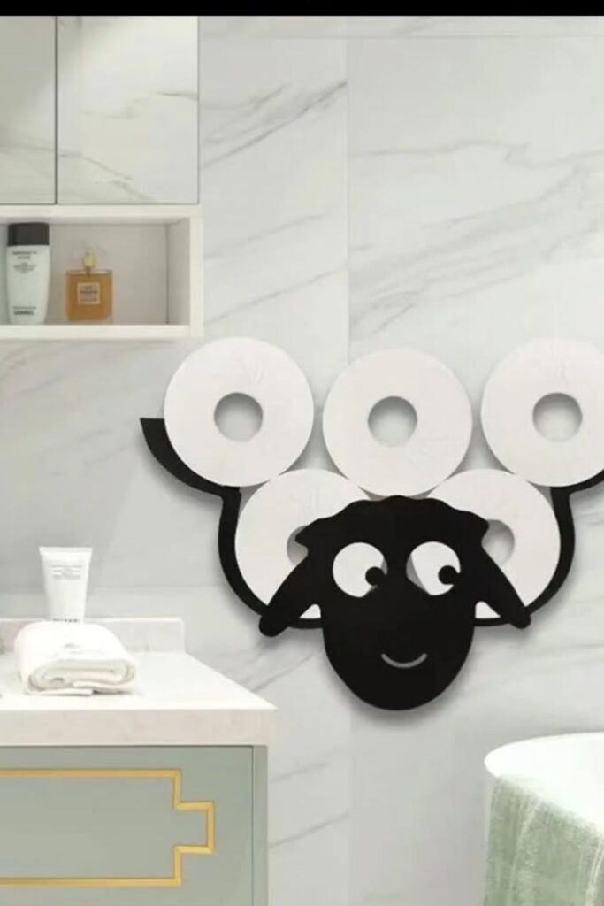 Bathroom storage does not always have to look serious. A playful wall holder shaped like a sheep turns extra toilet paper into part of the decor.