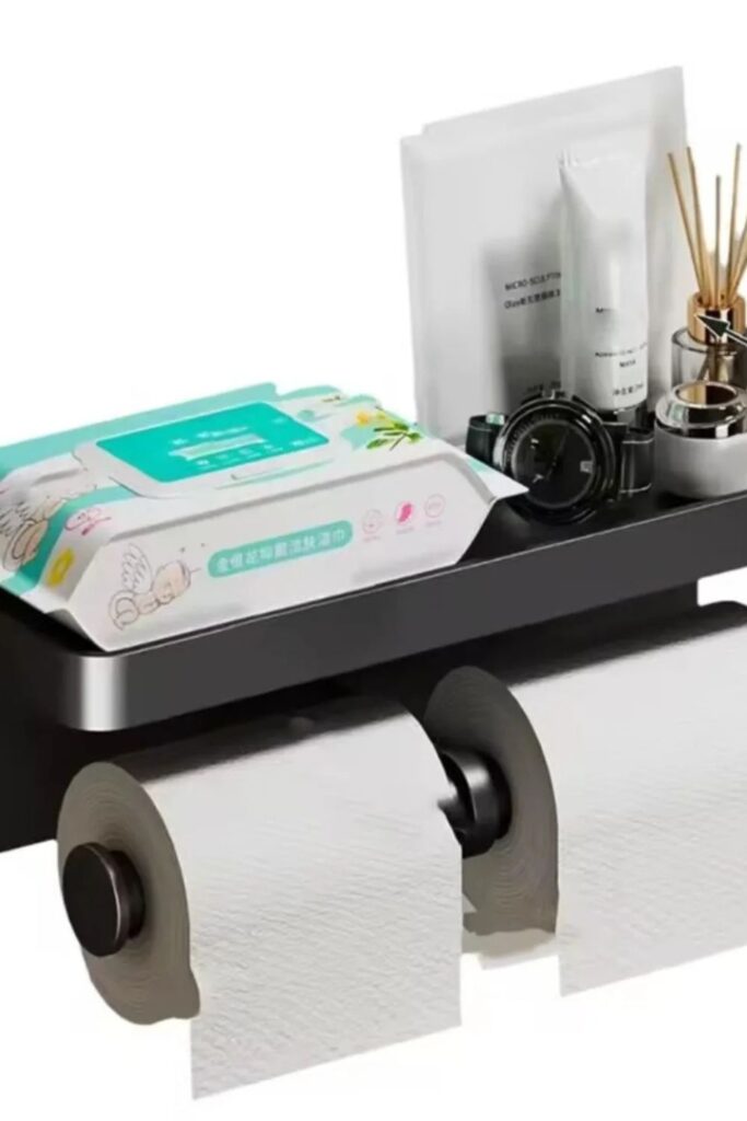Wall-mounted holders can do more than just hold a roll of toilet paper. A shelf holder like this adds a small.