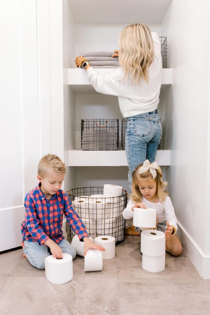 Families who buy toilet paper in bulk will find that making a simple system like this works quite well.