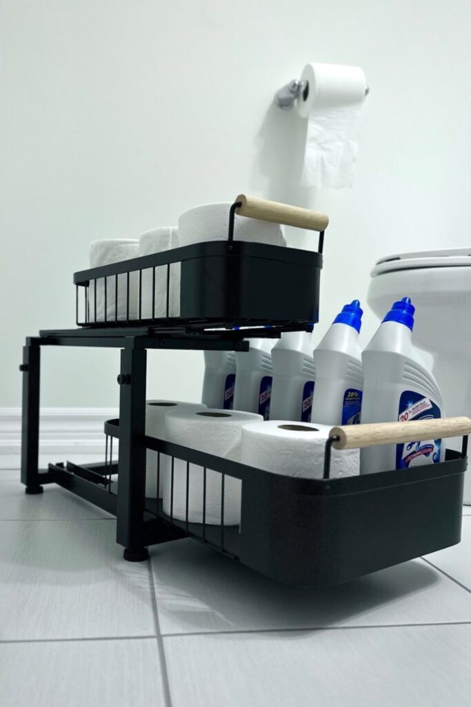 The lower baskets can house extra rolls of toilet paper, and the higher trays can hold cleaning supplies, wipes, or other things you need.