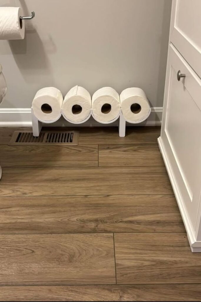 Extra toilet paper often ends up hidden in random cabinets, which makes refilling inconvenient.