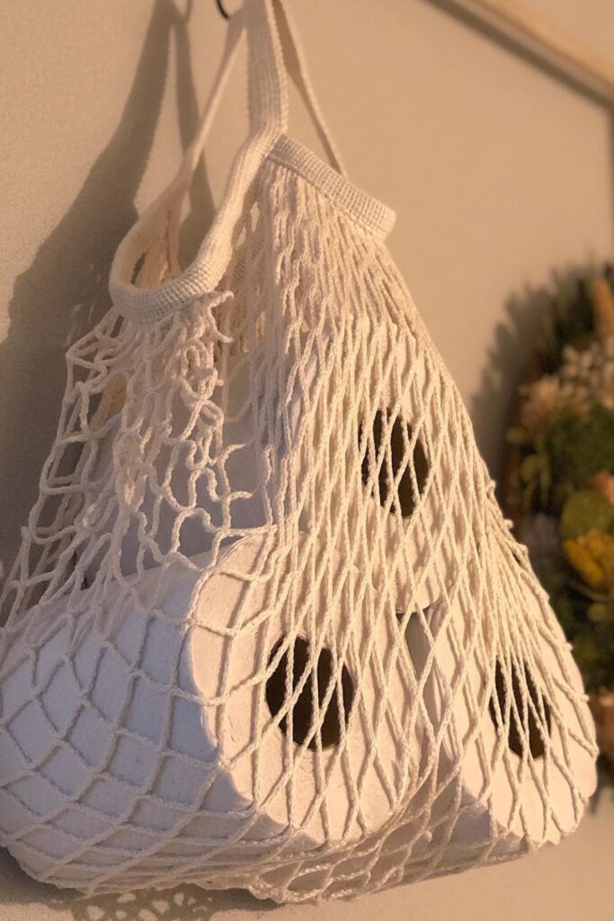 It’s easy to copy this idea: any strong hook and a reusable grocery-style mesh bag may quickly turn into useful bathroom storage.