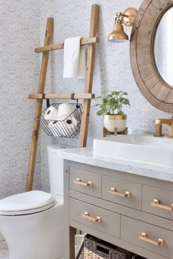 And a small wire basket on one step keeps excess toilet paper clean and simple to get to. Ladder shelves are great for bathrooms where it isn’t a good idea to drill shelves into the wall.