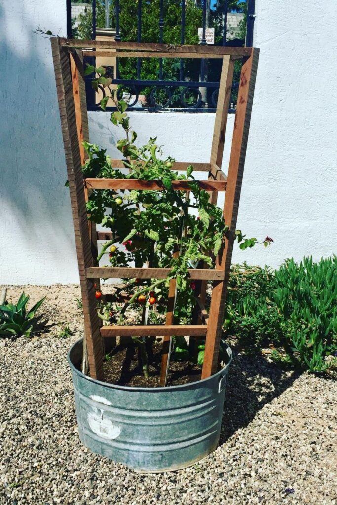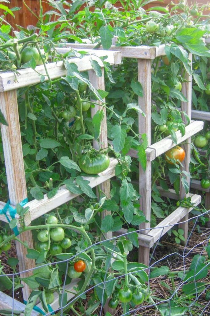 A wooden grid trellis is a great choice for keeping sprawling tomato varieties neat.