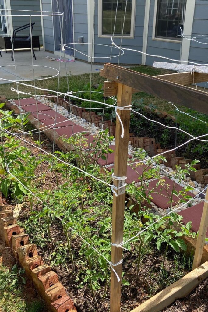 This setup uses wooden stakes and horizontal string lines to guide young tomato plants as they grow. It’s easy to adjust, ensures good airflow, and keeps stems upright.