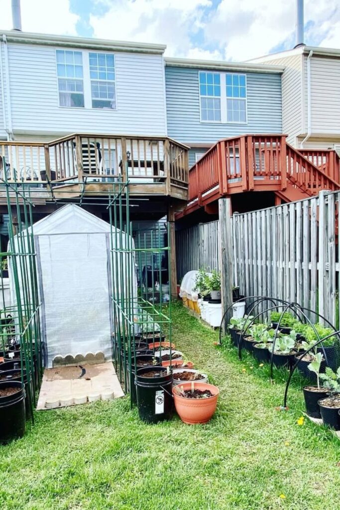 This double-row design forms a covered pathway for container tomatoes, encouraging growth up and inward.