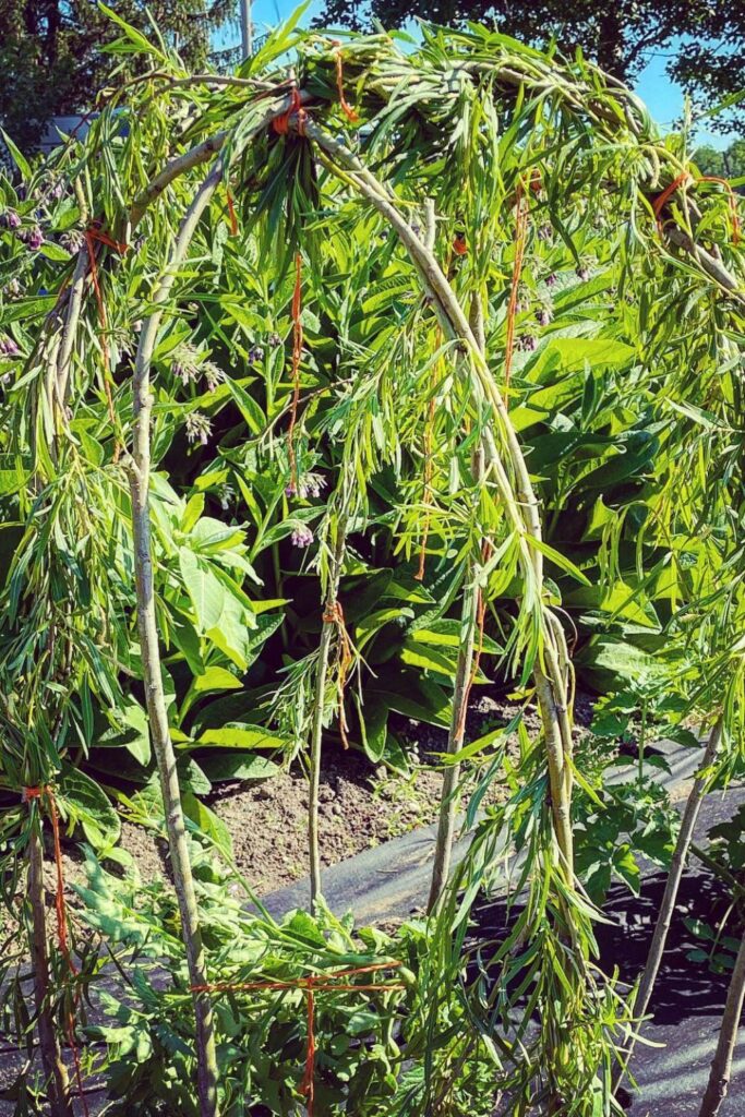 Using flexible young branches, this natural design present a sturdy, rustic framework for larger tomatoes to climb.
