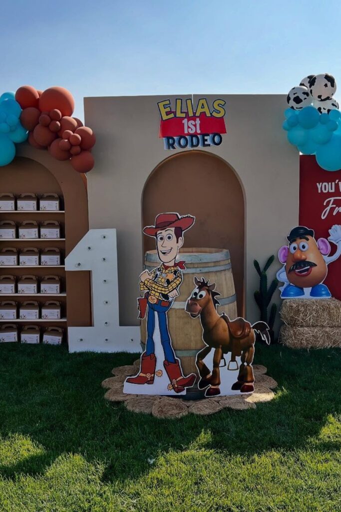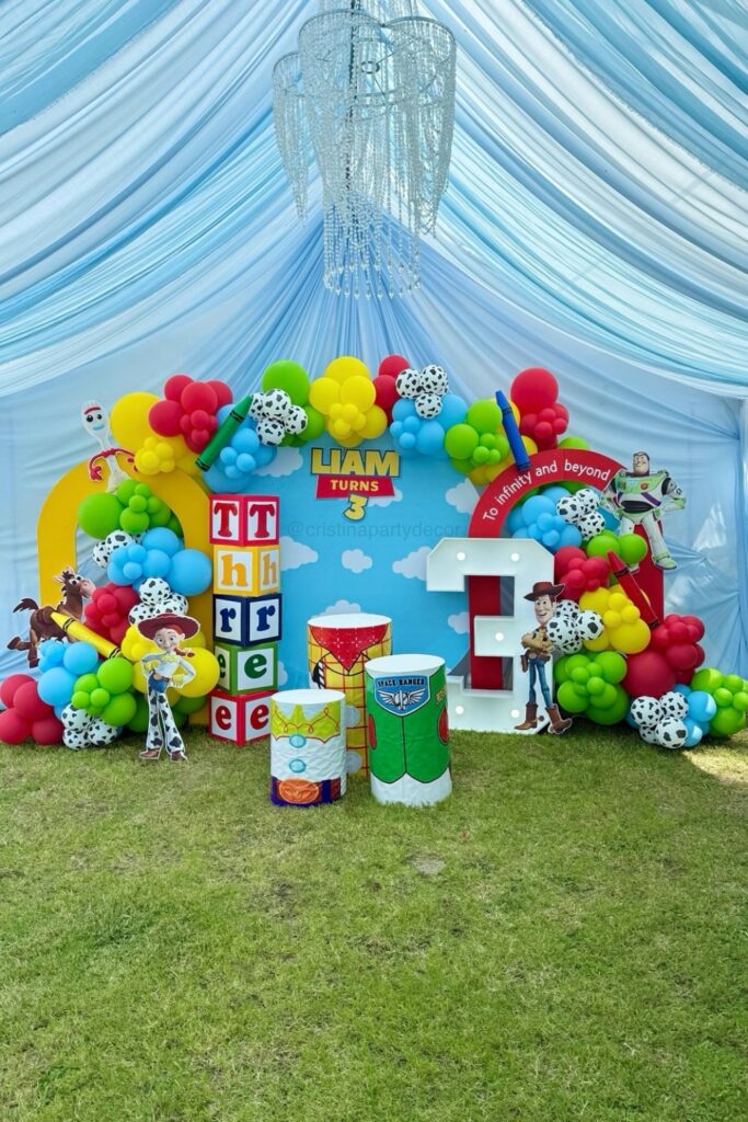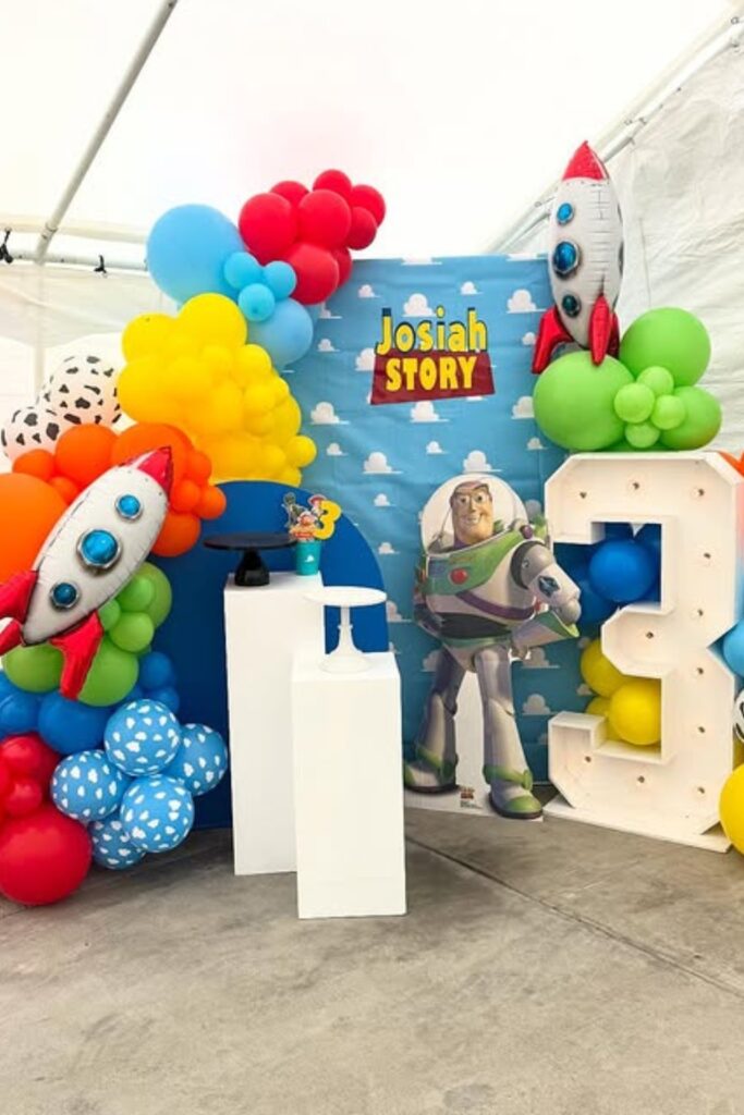 This colorful setup brings the Toy Story theme to life fast. Use it as the main photo or cake area where everyone gathers.