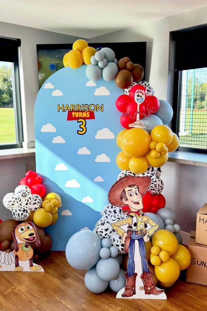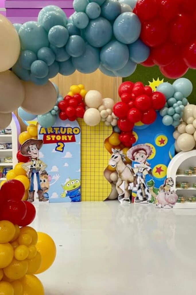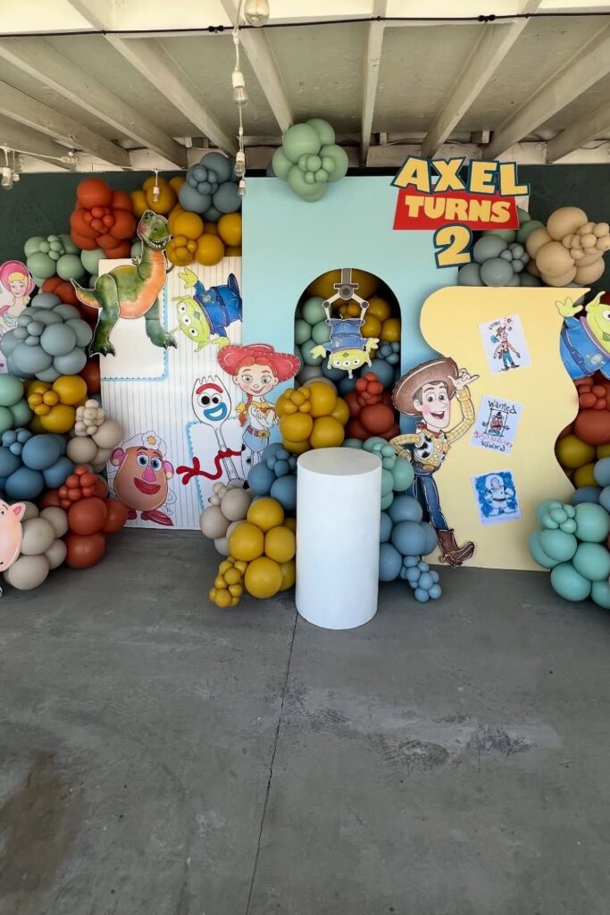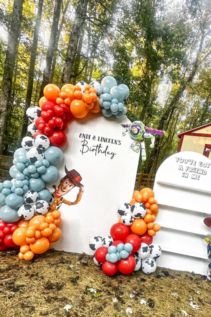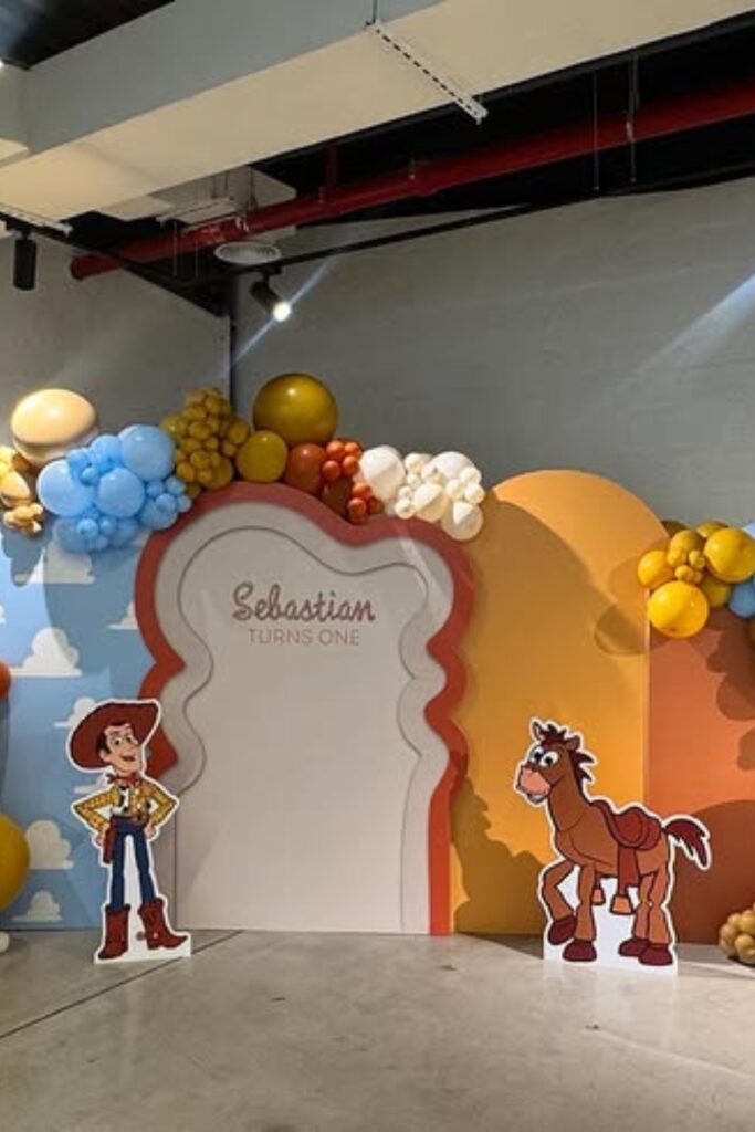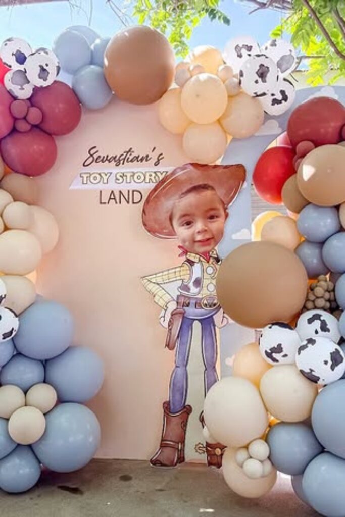 Use oversized character cut outs to bring the Toy Story world to life. Layer balloons in earthy browns, yellows, and soft blues for warmth.
