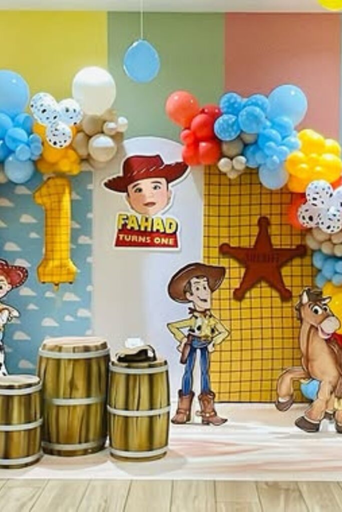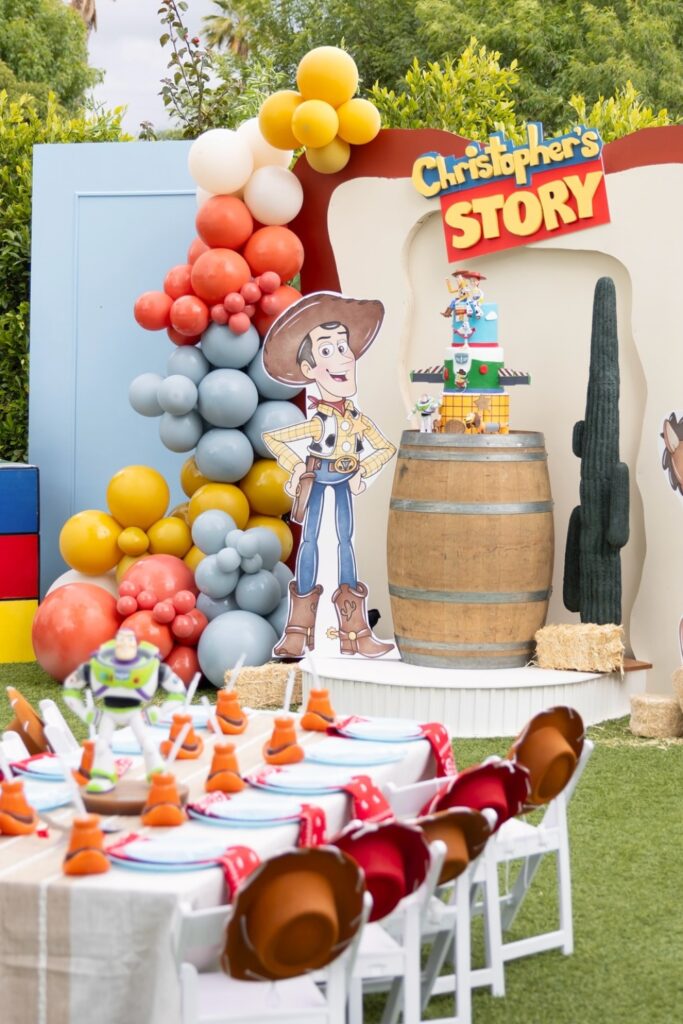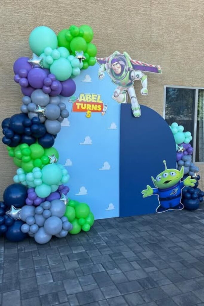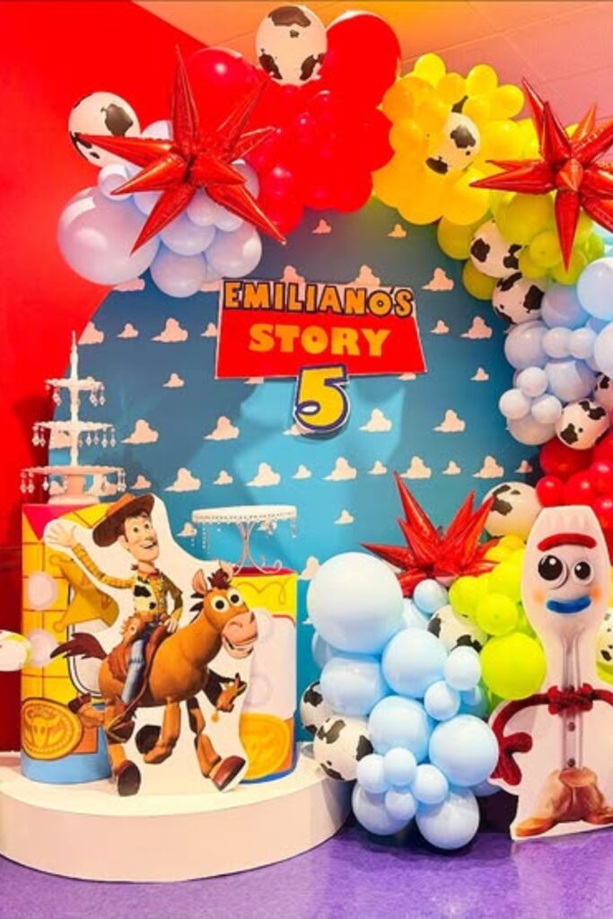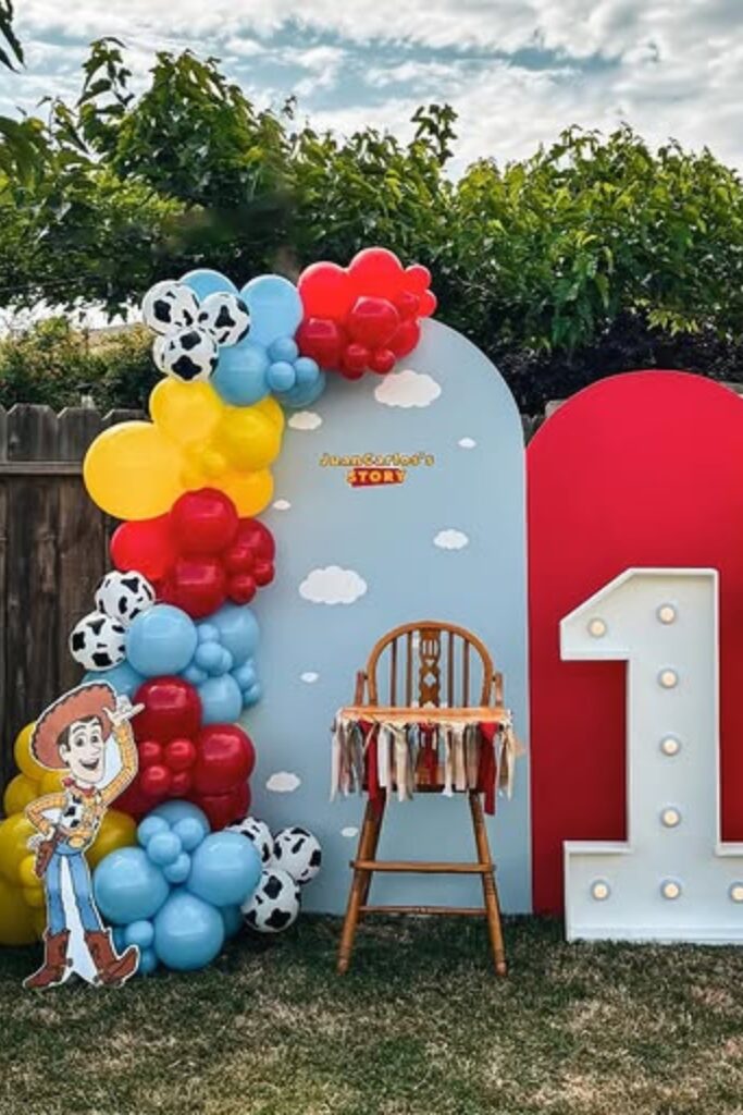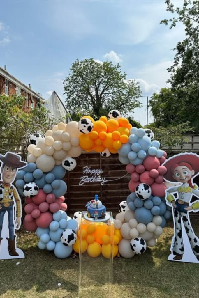 Use oversized character cut outs to bring the Toy Story world to life. Layer balloons in earthy browns, yellows, and soft blues for warmth.