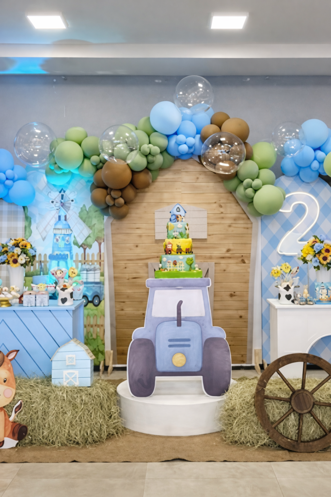 Build a wide balloon garland in greens, blues, and browns to create a farm feel. Place key setups, like the cake and desserts, in separate zones.