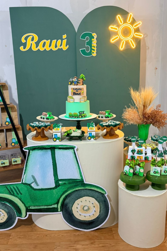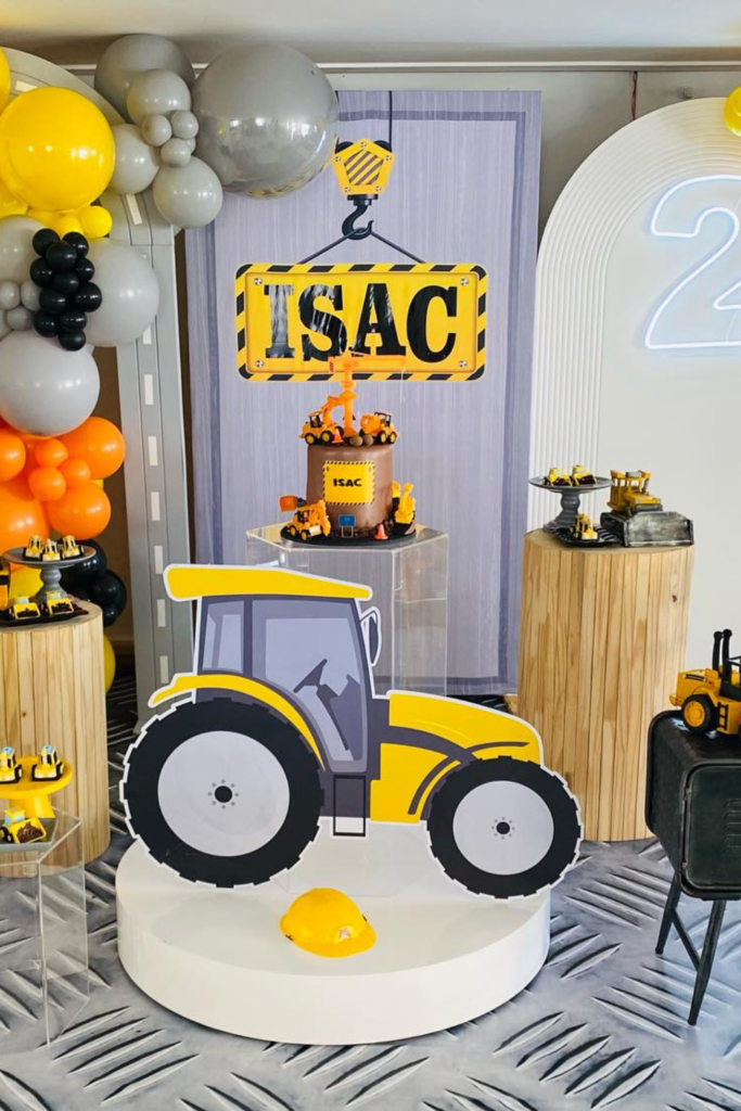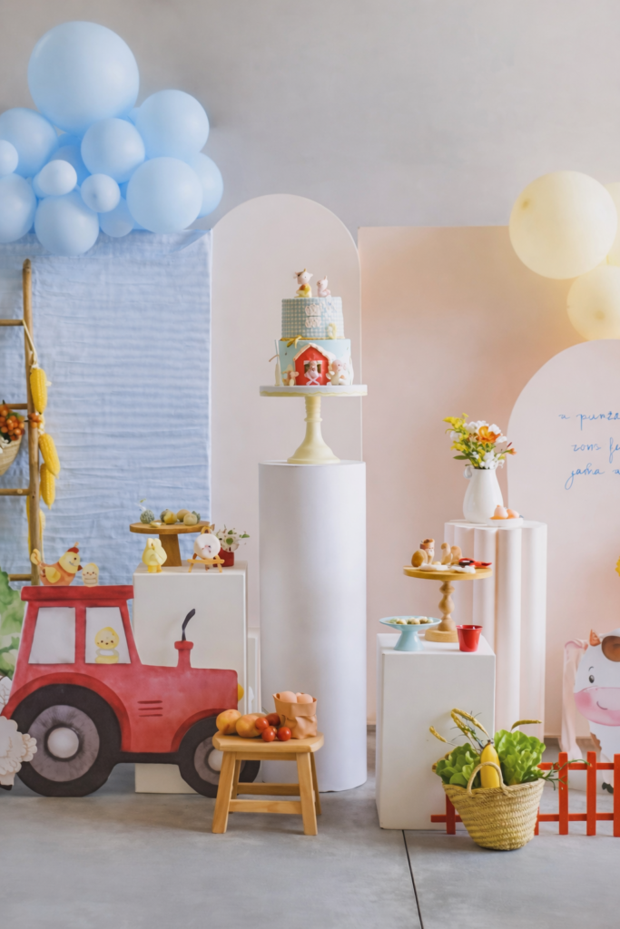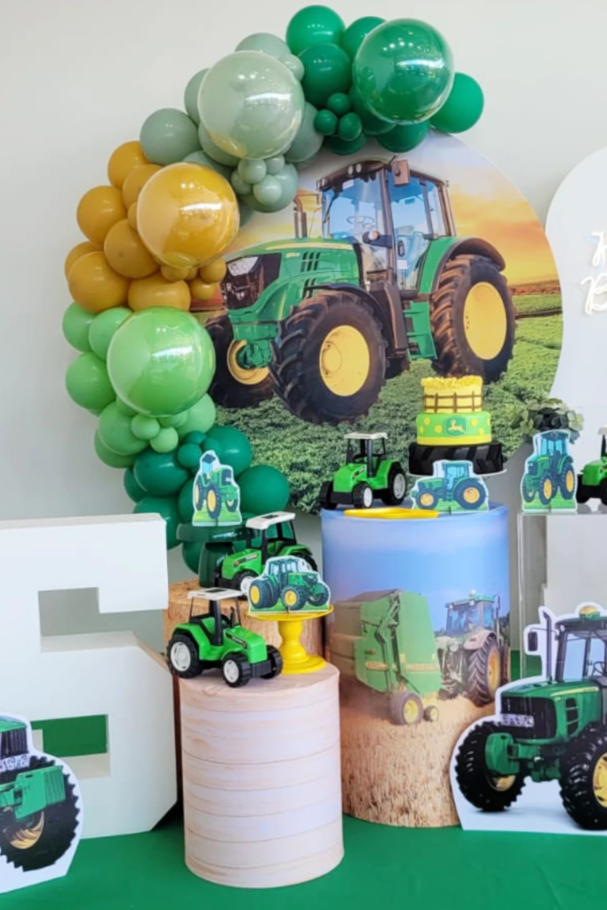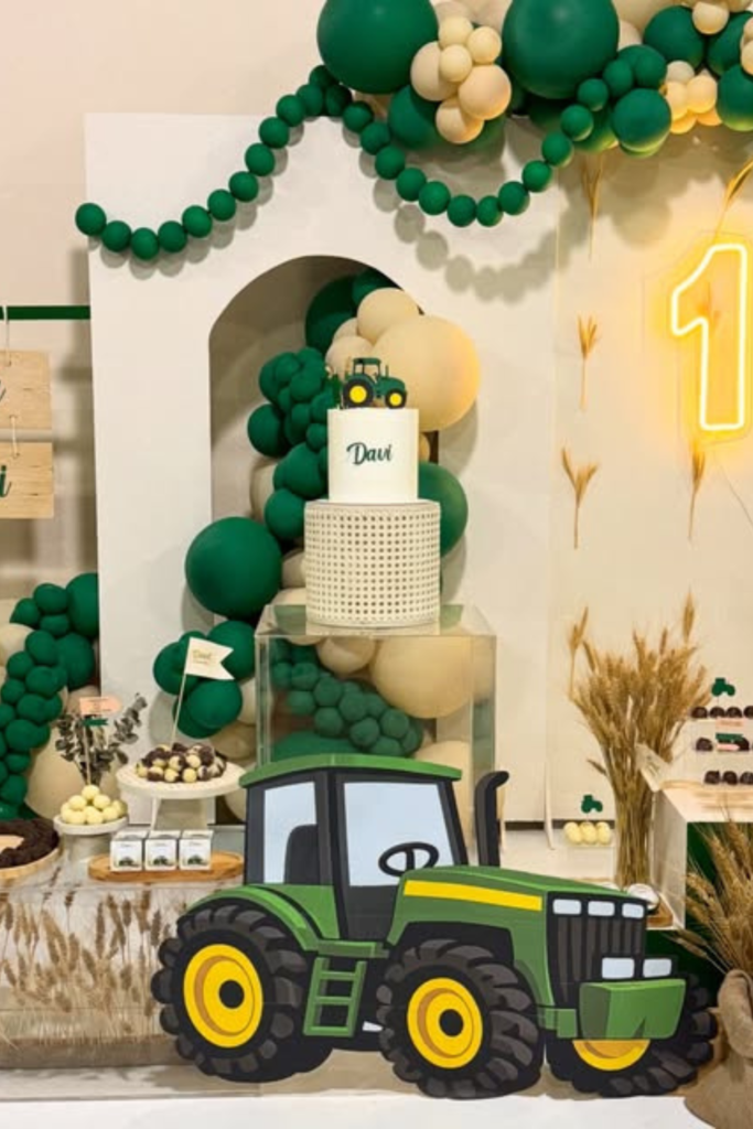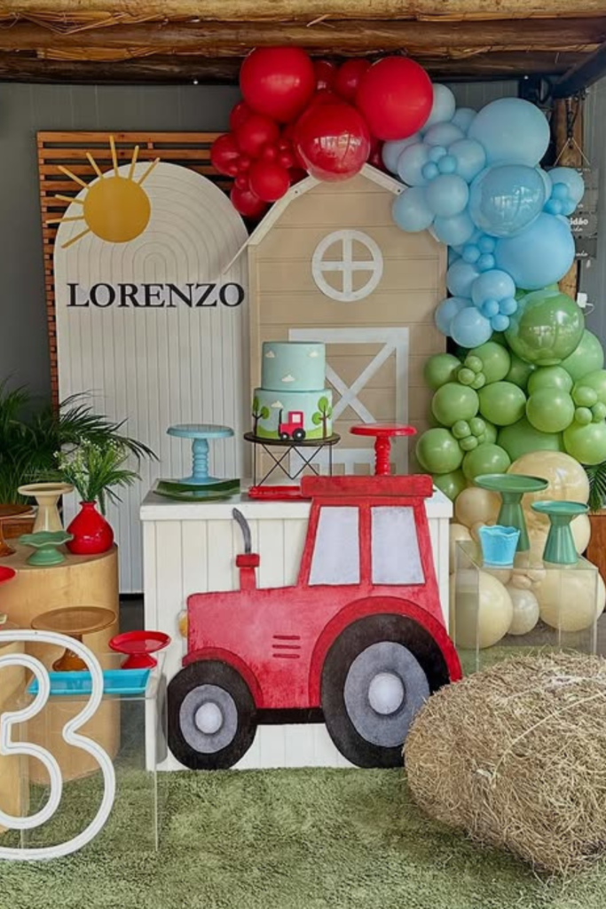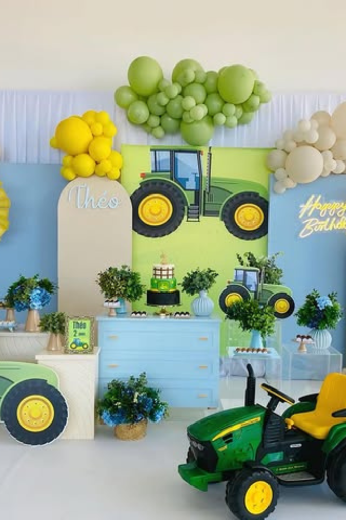 Tractor cutout or themed backdrop helps set the scene, but it won’t hold their interest for long. Pair decor with something they can touch or play with, like ride-on toys or activity stations.
