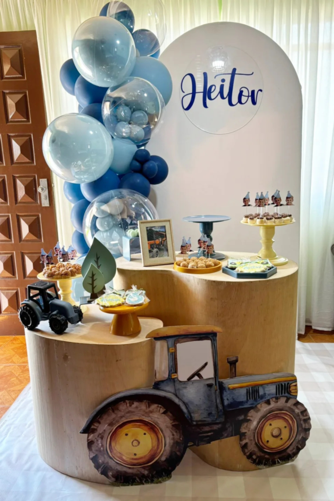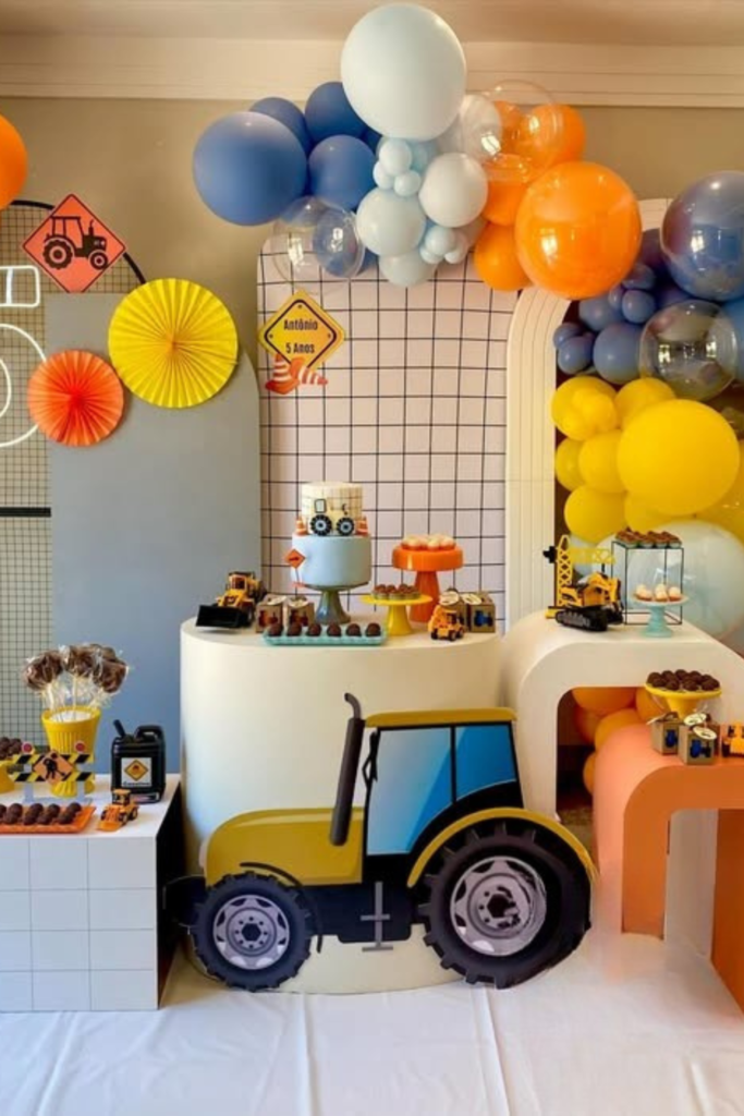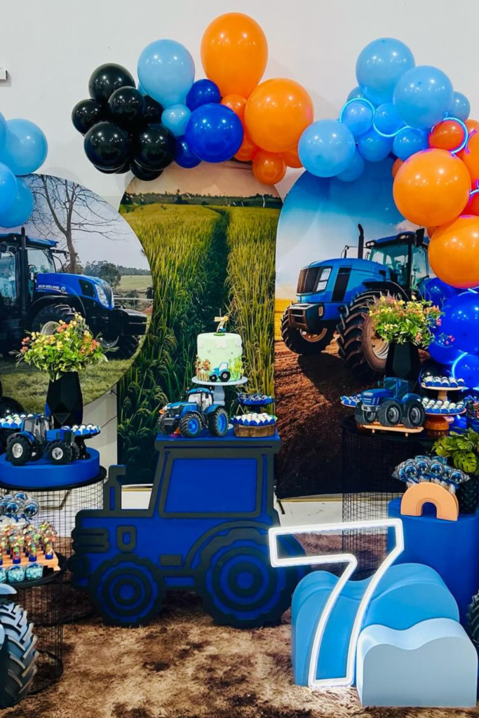 Build this look around bold blue and orange balloons, then anchor it with large tractor backdrops on both sides.