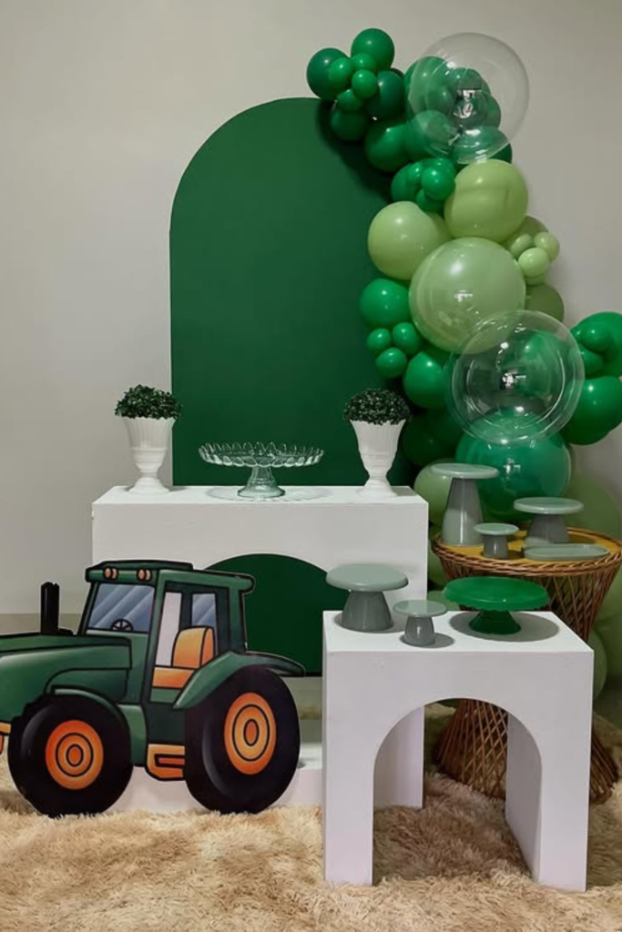 Use a solid green backdrop. Keep decor limited to one balloon cluster on the side for balance. Add a simple tractor cutout in front.