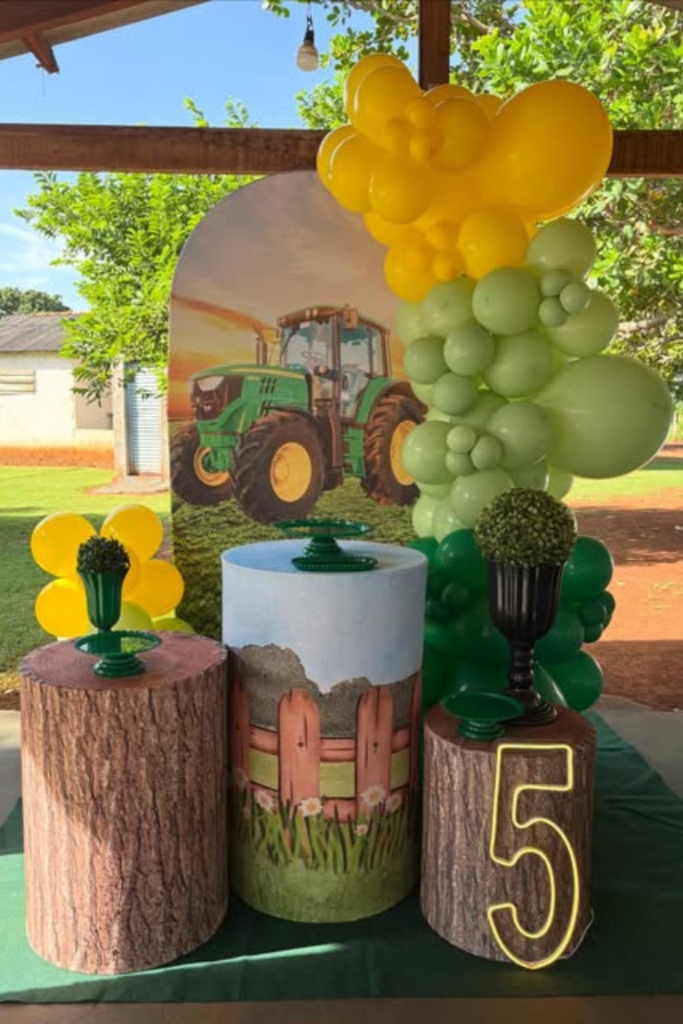 Layer green and yellow balloons along one side to frame the scene rather than cover it. Add small toy tractors on different height stands.