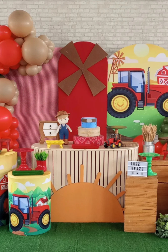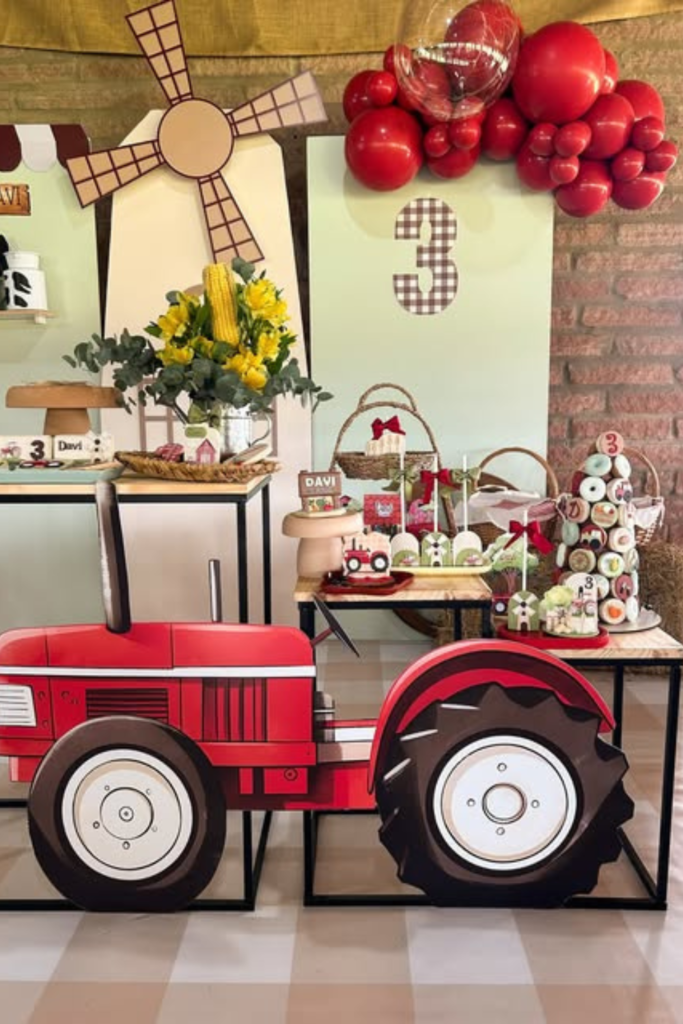 A life-size tractor cutout instantly becomes the center of attention. Red balloons on one side balance the setup and keep the look bold.