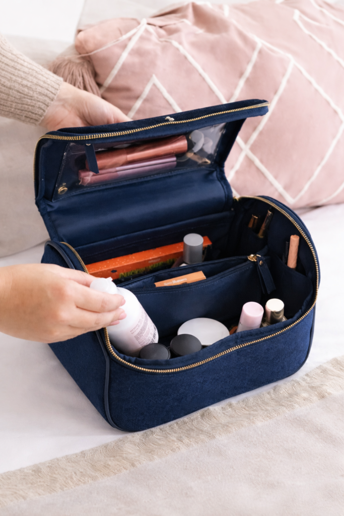 Keep daily essentials closest to the zipper. One glance inside shows exactly what you have, so getting ready feels organized.