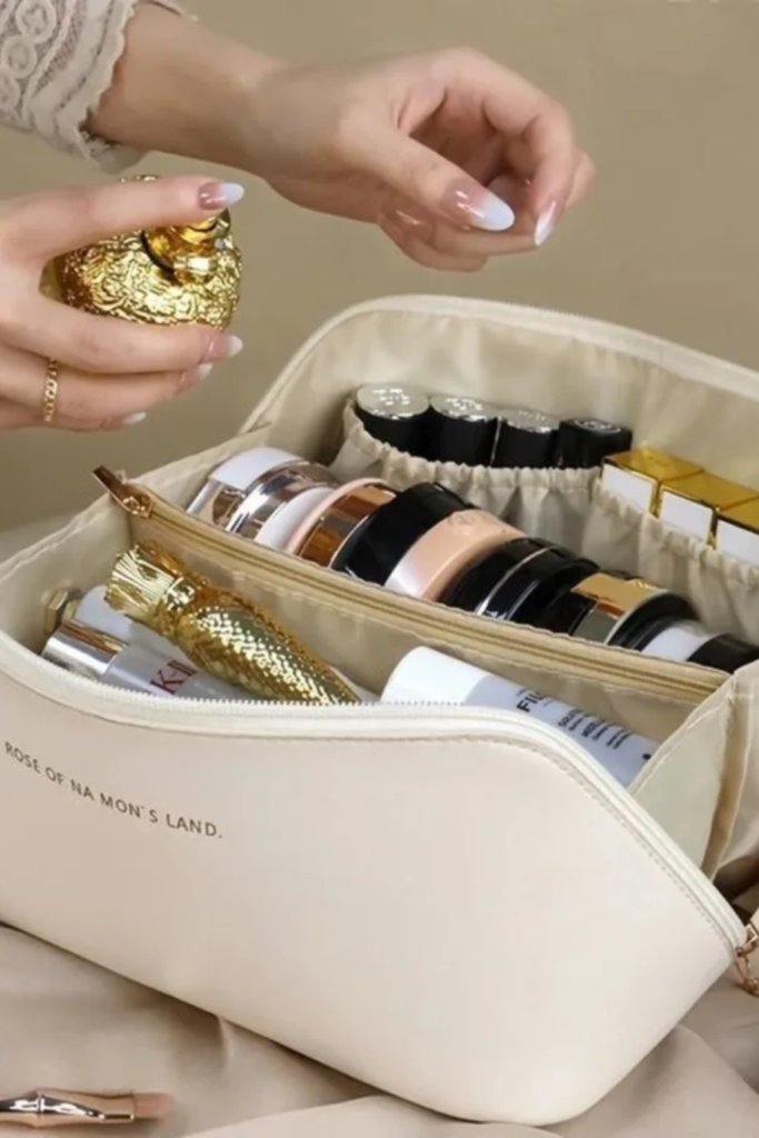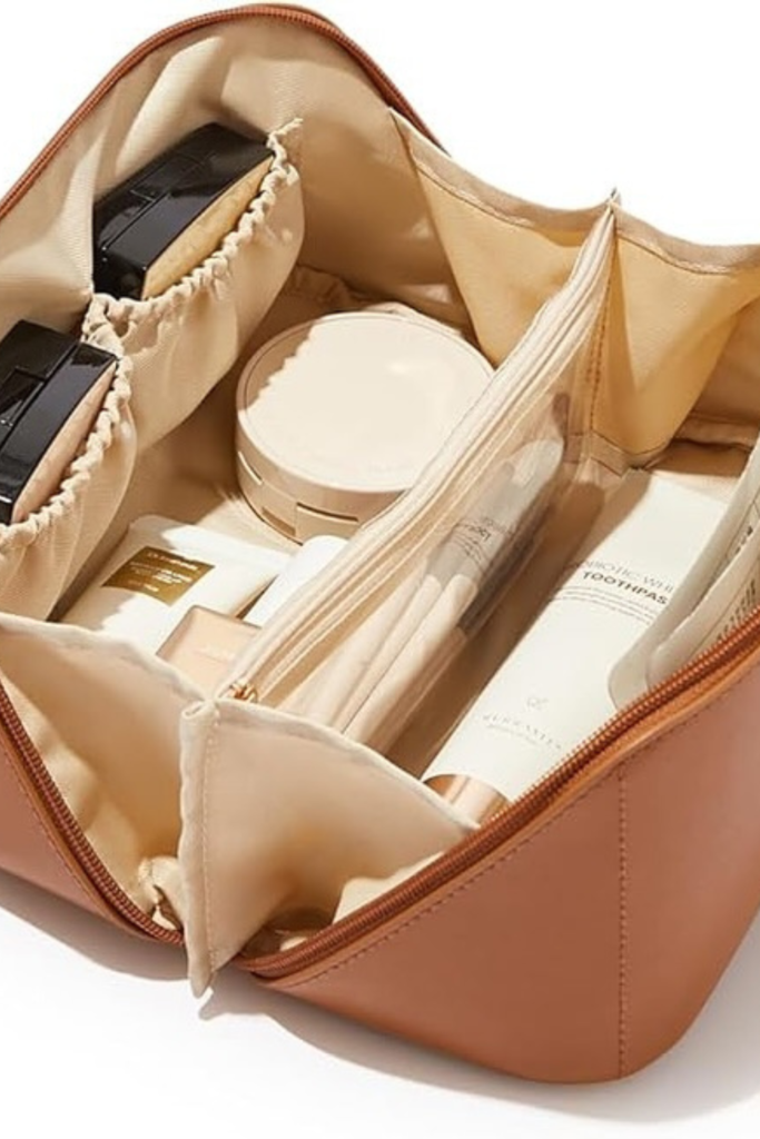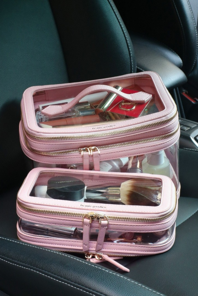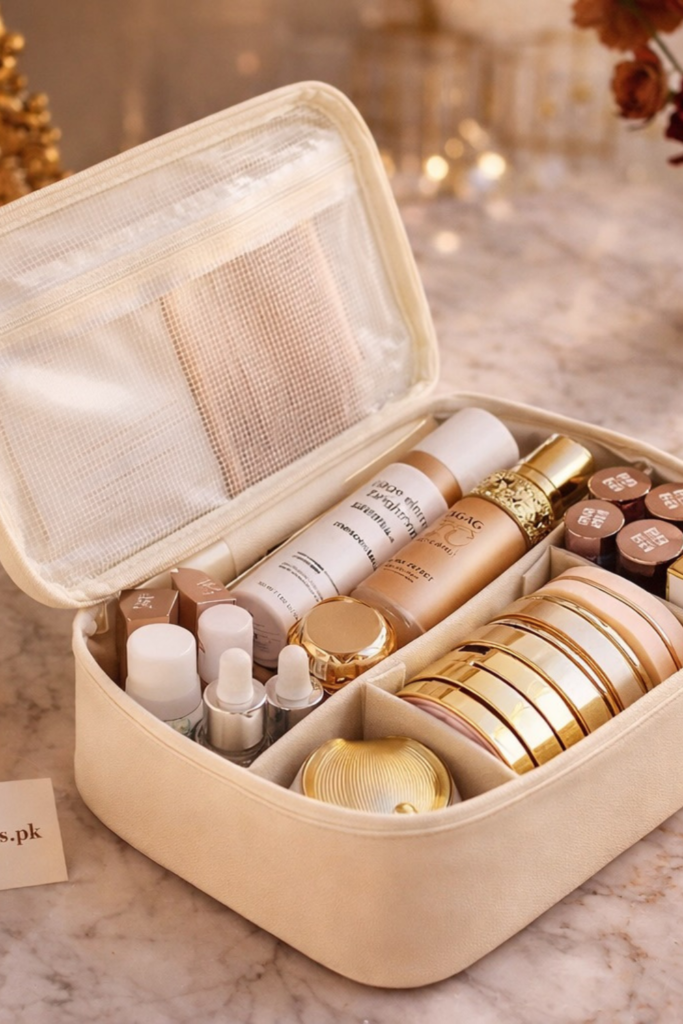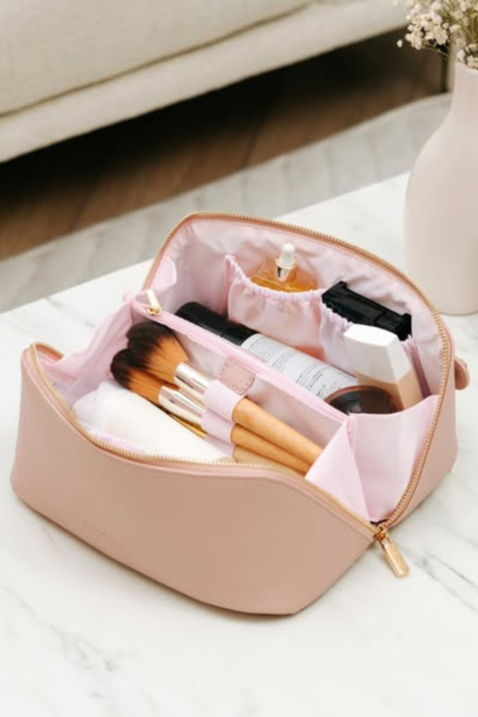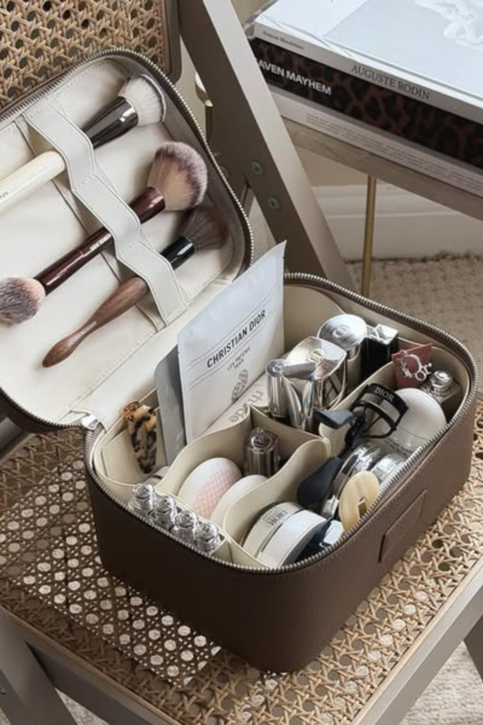 You’re carrying both skincare and makeup. Clear boundaries keep expensive products protected and easy to reach.