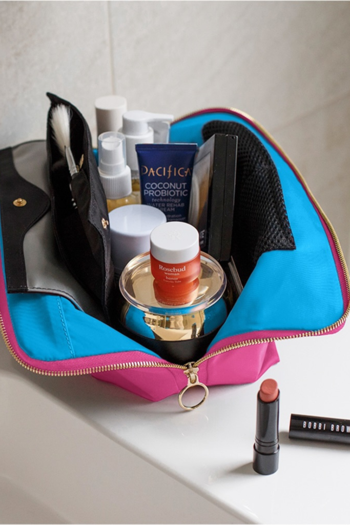 Use this setup for longer trips when you’re carrying a full routine. Pack by function: face products on one side, tools in the middle