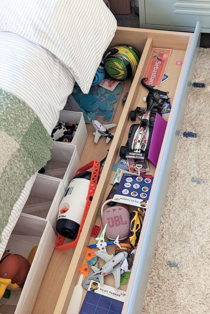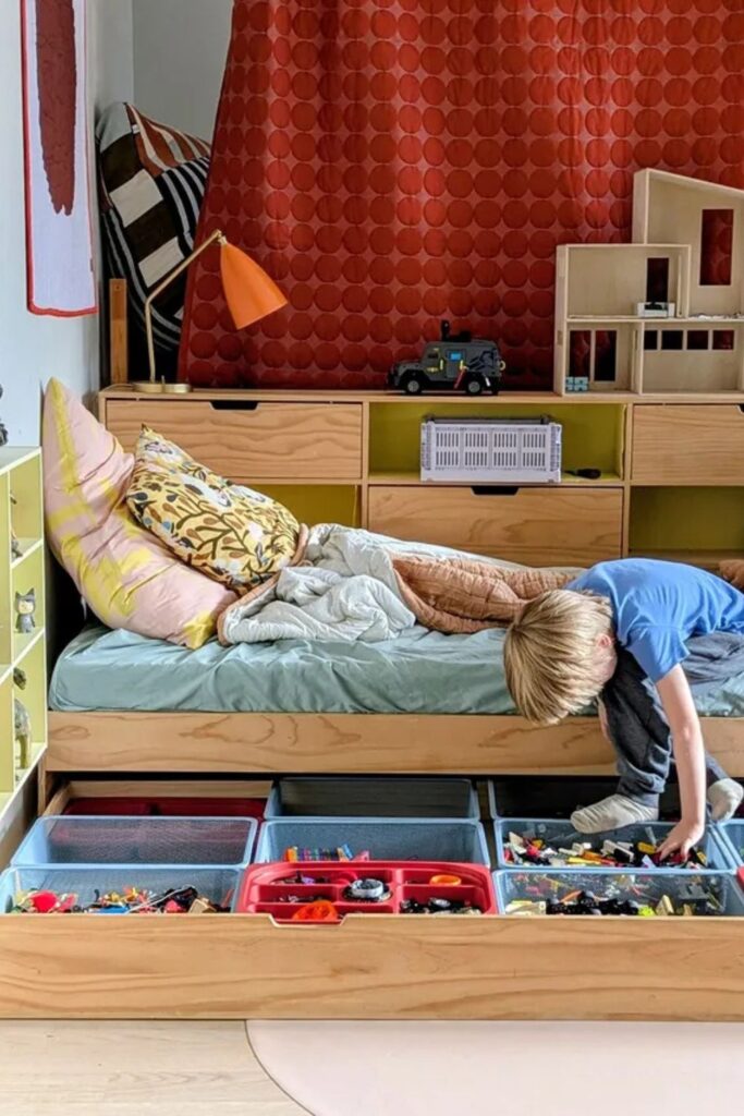 Loose toys tend to spread across the floor faster than expected, especially in kids’ bedrooms. A long pull-out drawer under the bed.