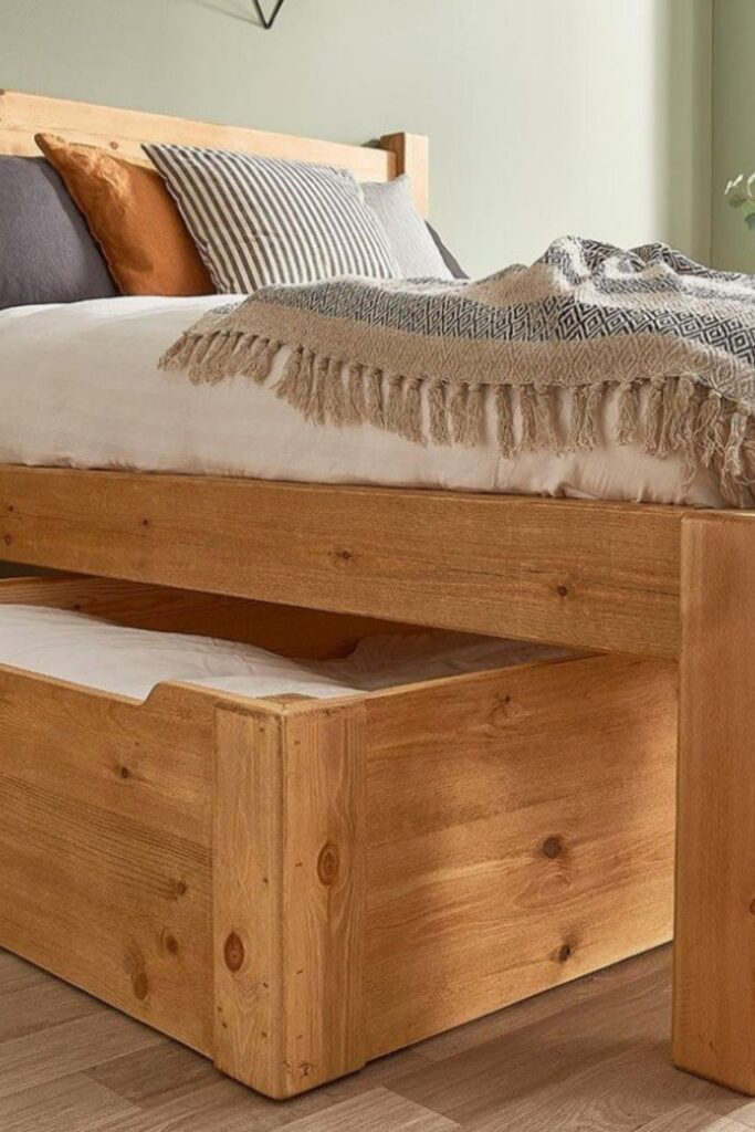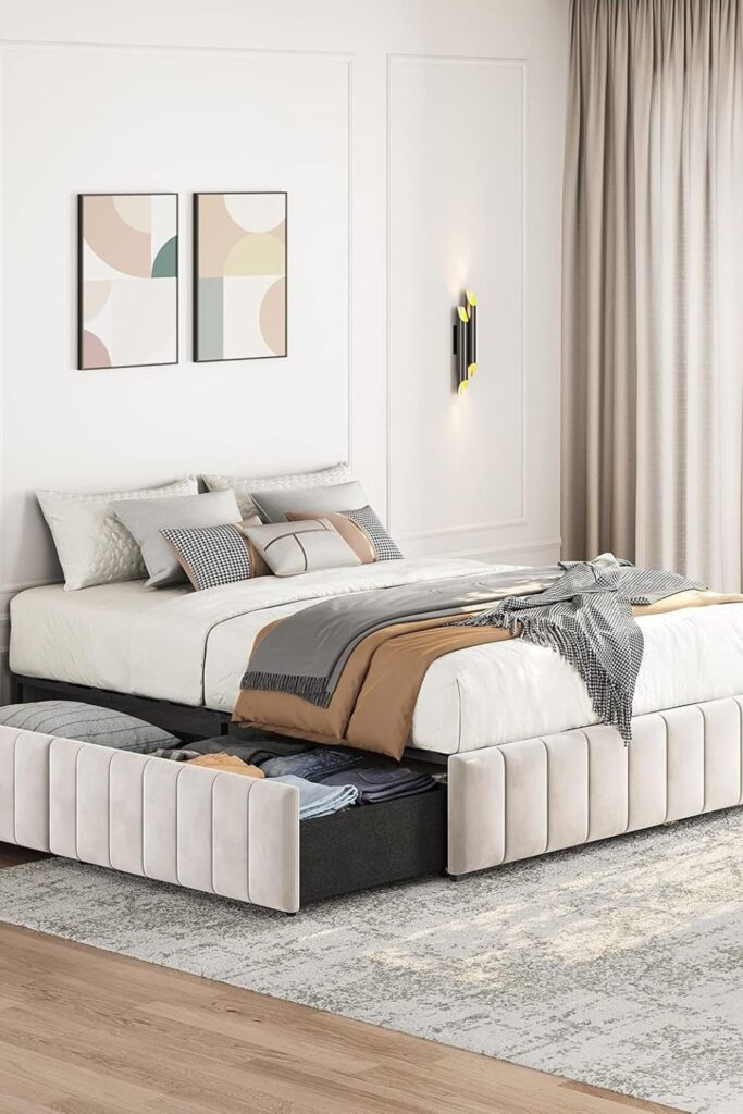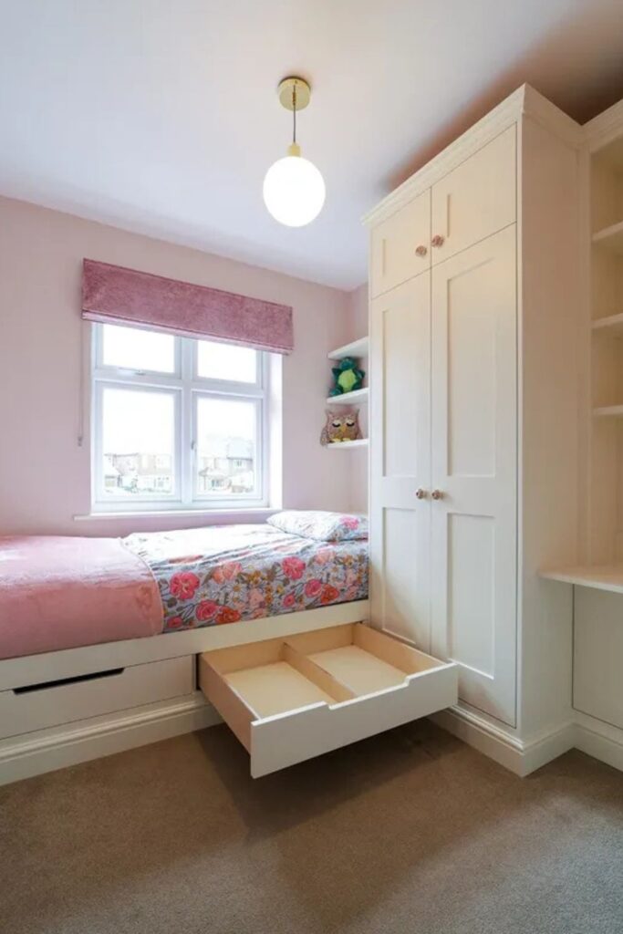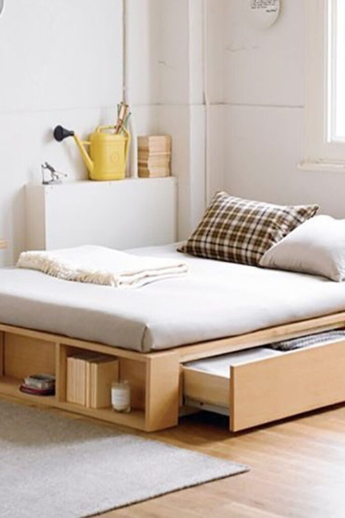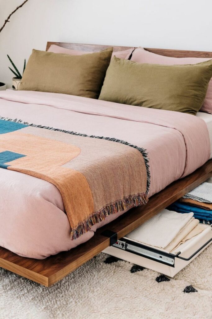 A platform bed with built-in drawers uses the whole base of the bed as organised storage, so the room doesn’t get cluttered with extra bins or containers.