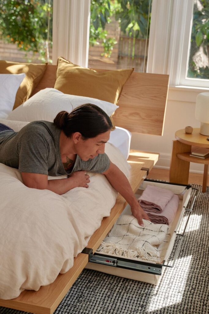 Cold nights often lead to extra blankets piling up on chairs or at the foot of the bed. A deep rolling drawer underneath the bed keeps those bulky layers tucked away.