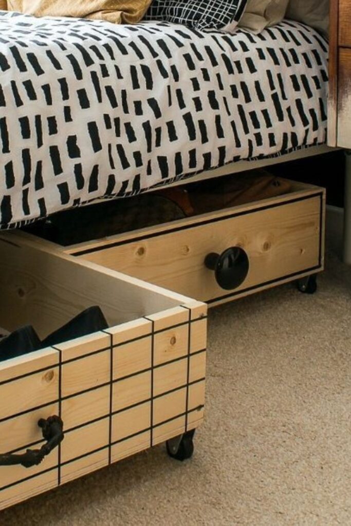 This method works best in bedrooms that don’t have built-in bed storage since it adds a movable drawer system without having to change the bed frame.