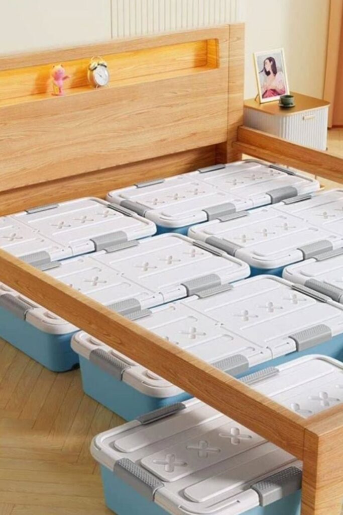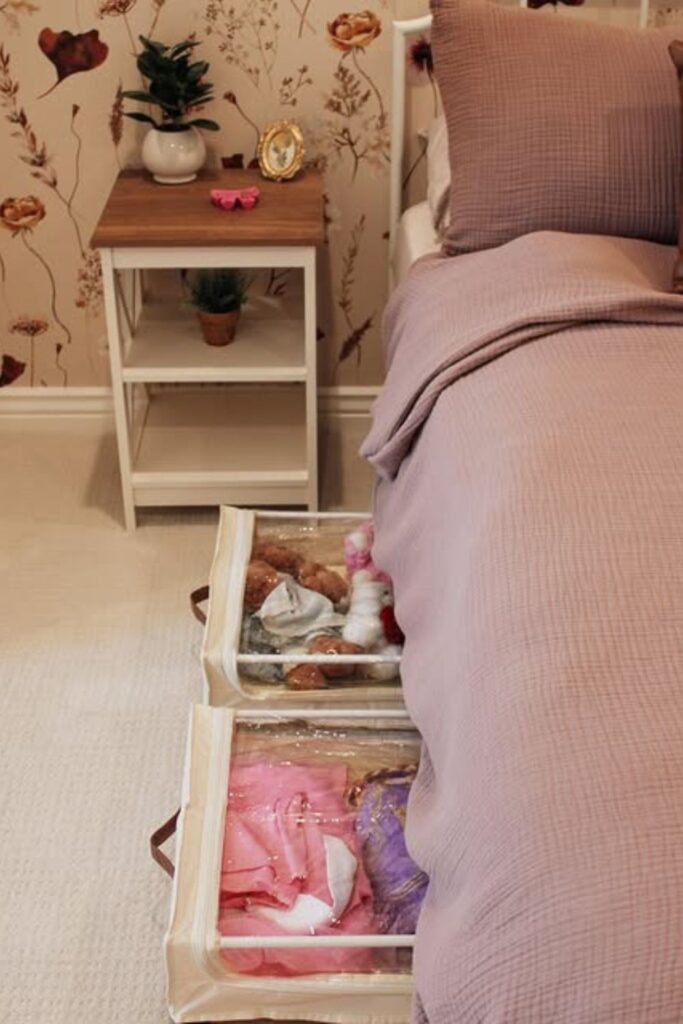 Empty space under the bed becomes surprisingly useful when it’s divided into organized sections.