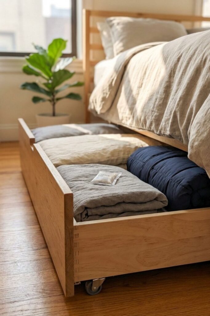 Clutter disappears quickly once storage moves onto wheels. Rolling wooden drawers under the bed create flexible storage that slides out easily whenever something is needed.
