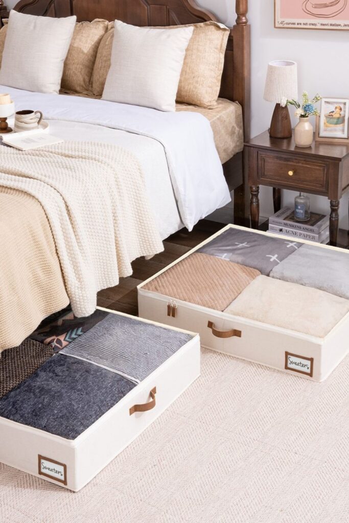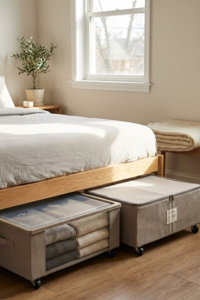 Seasonal clothing usually gets mixed together once it’s stored away. Labeled bins under the bed solve that problem by giving each season its own container.