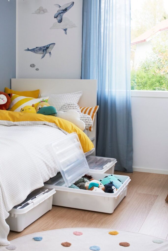 Kids can easily reach anything in large plastic containers under the bed, which makes it easy to keep things organised.