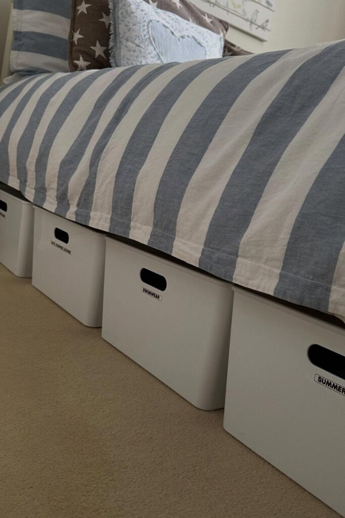 Putting the bins next to each other makes a neat row that keeps hidden when the bedspread falls over the edge.