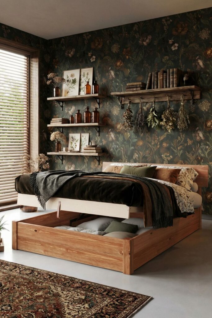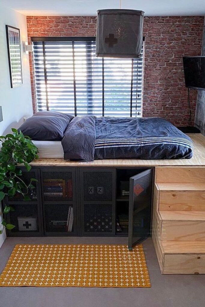 Small rooms gain a surprising amount of space once the bed sits on a raised platform. Instead of leaving the area underneath empty, the platform base turns into a full wall of storage.