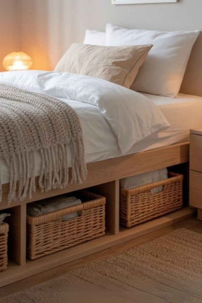 Each basket becomes a small storage compartment that slides in and out easily. This design is easy to copy with platform bed frames that include open cubby portions.