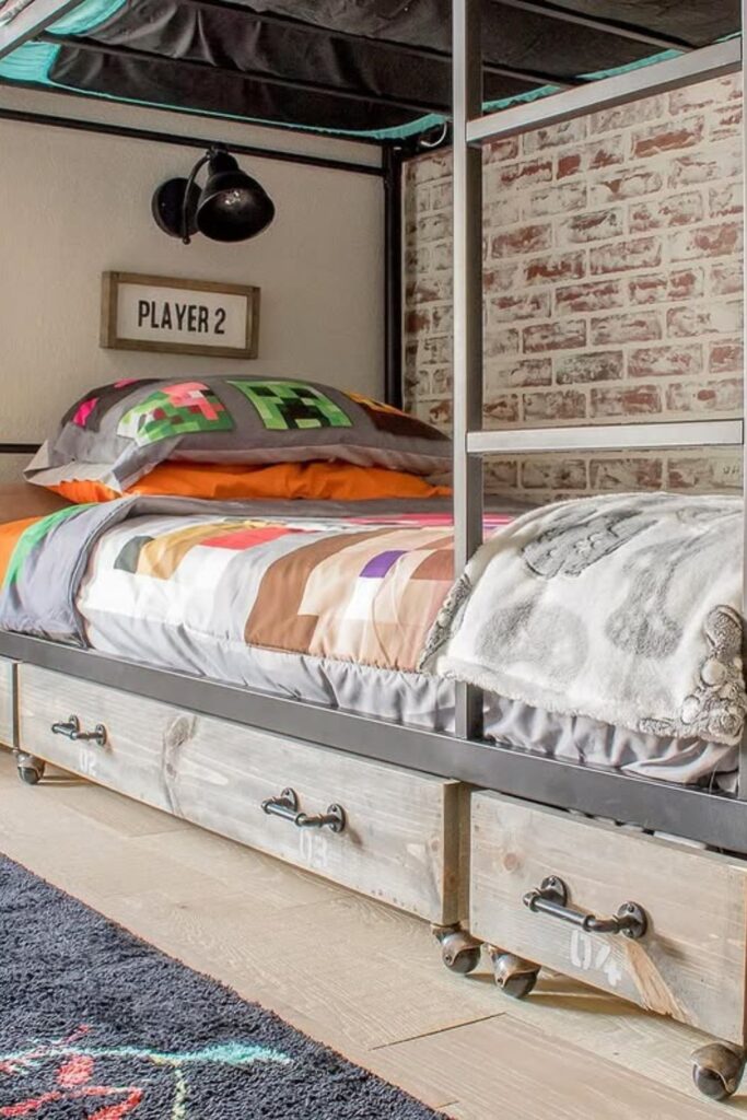 This setup is easy to copy because the bed frames are made of wood and have drawers built in. Smaller bins or split trays inside each drawer keep different types of toys separate.