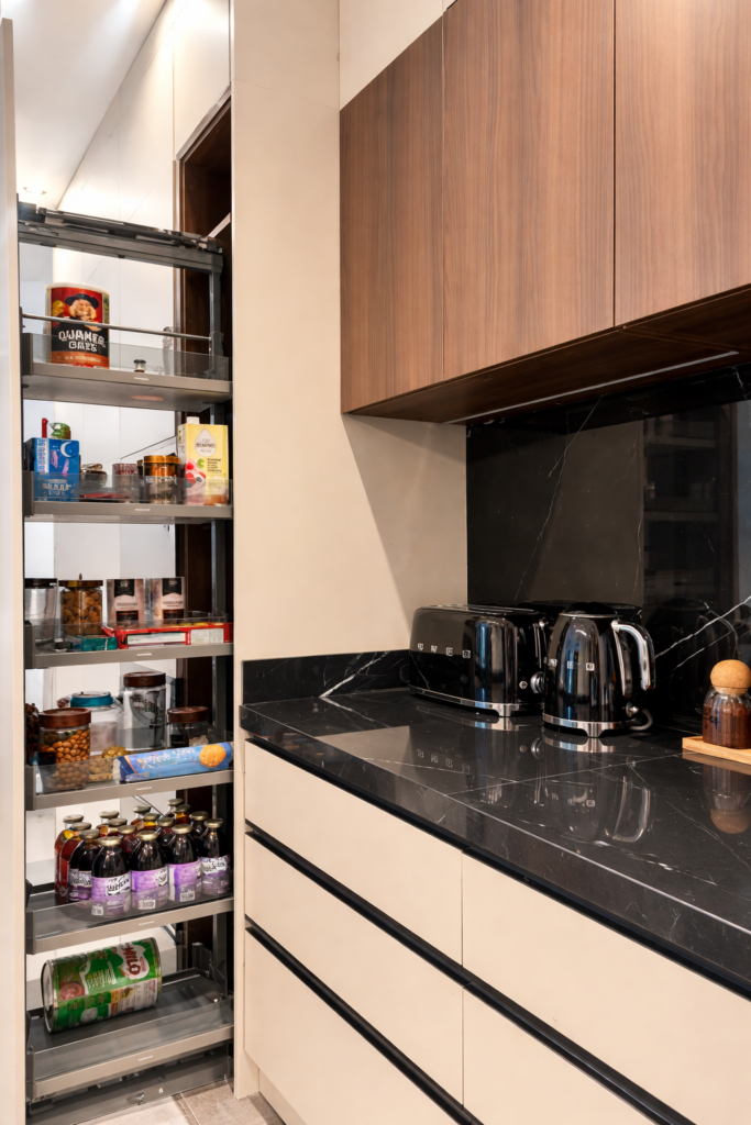 Slim pull-out pantry hardware built into cabinetry. Under-cabinet lighting covers prep areas, interior pantry lights keep every shelf easy to scan.