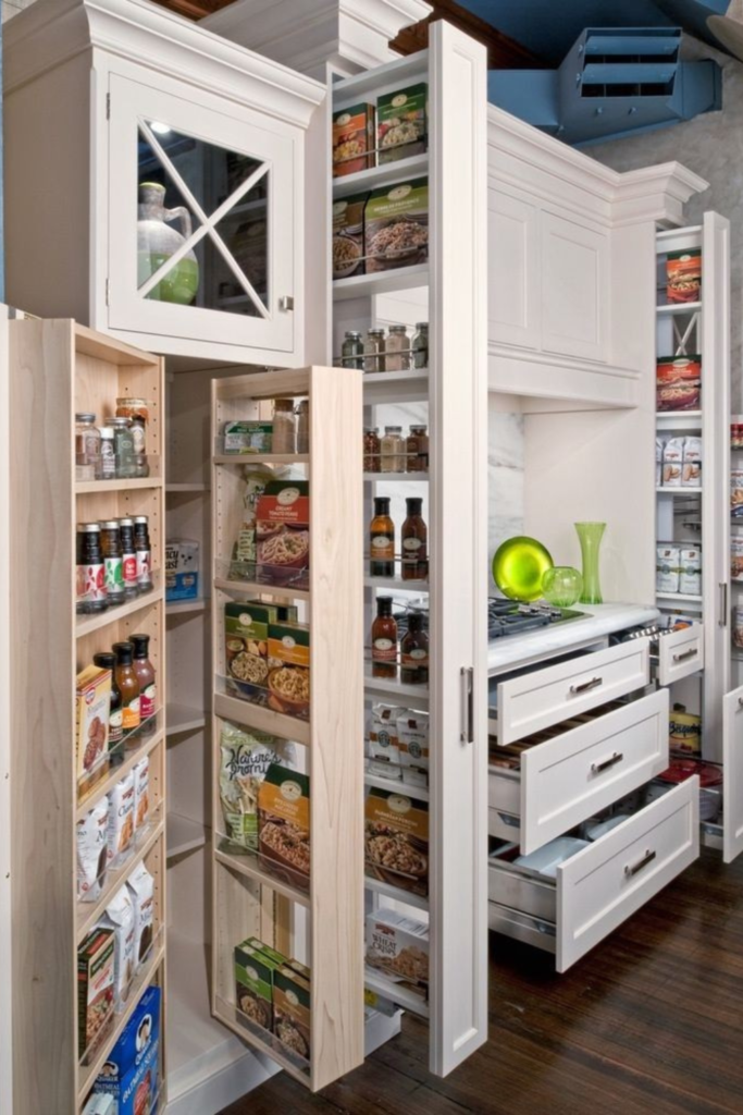 Narrow gaps beside counters turn into high-capacity storage with vertical pull-out pantry units, works well.