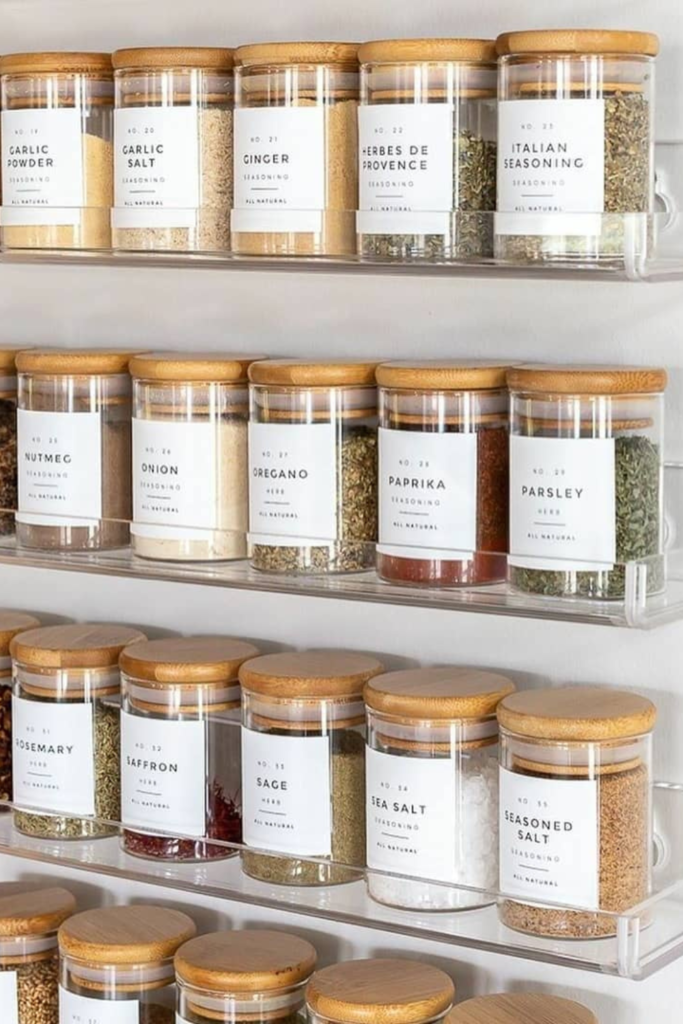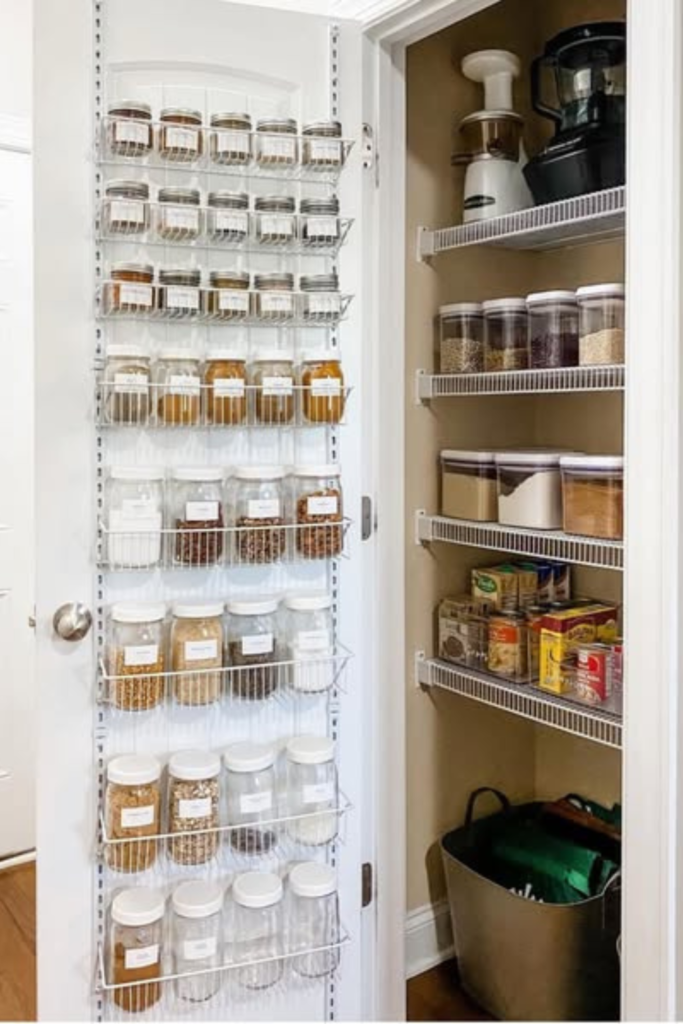 Pantry doors turn into high-capacity storage once vertical racks move spices off shelves. This setup works best inside pantry.
