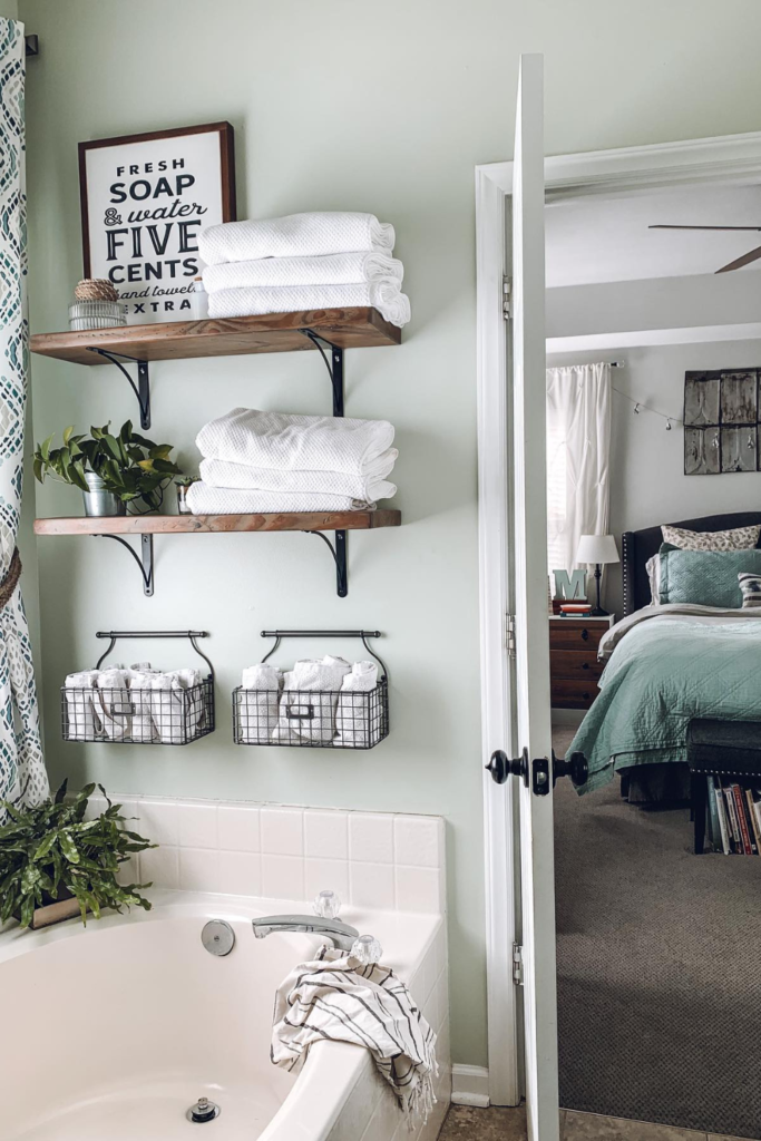 Empty bathroom walls turn useful once shelves stack upward above tubs or sinks. Open shelving works best for towels.