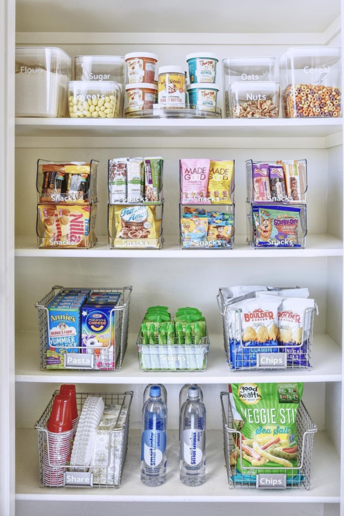 Grouping food by category keeps every level easy to scan. Wire bins stop small items from tipping forward.