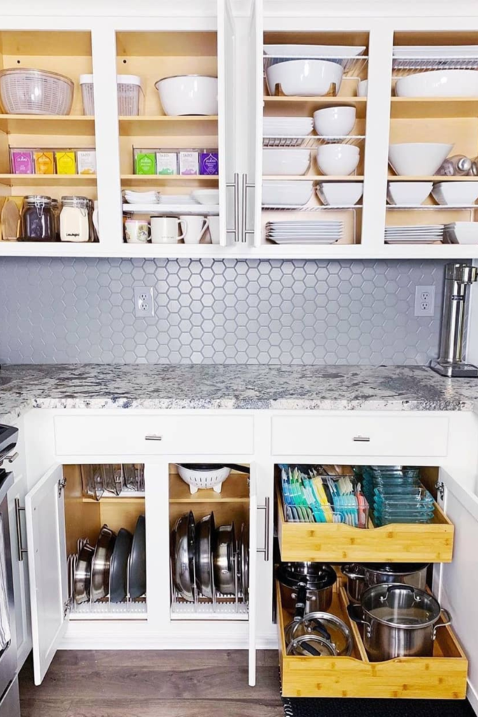 Lower cabinets stop wasting space when cookware stands upright. Sliding drawers add another layer of height for heavier pots.