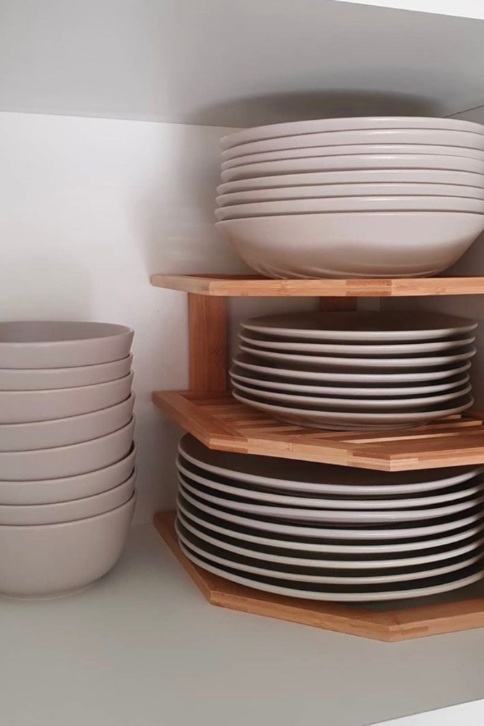 Extra levels keep sets separated, preventing shifting of stacks. Use wooden shelf risers sized to cabinet depth.