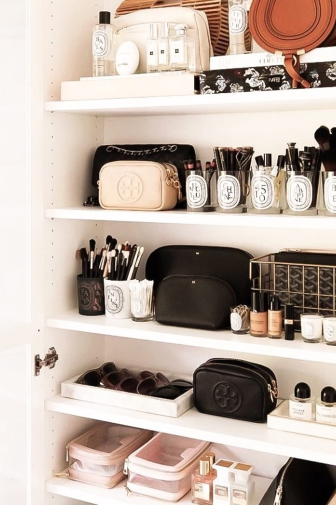 Beauty storage stays calm once products spread upward. Tall cabinet shelves work best in bedrooms.