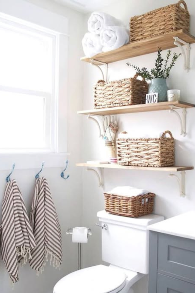 Bathroom corners start working once shelves rise above the toilet. Stacked wood shelves fit perfectly in small bathrooms.