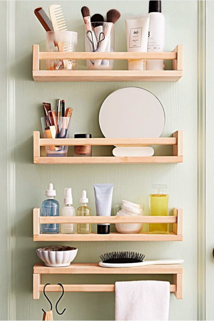 Shallow shelves hold daily skincare and grooming items. Use lightweight wood racks anchored into solid doors.